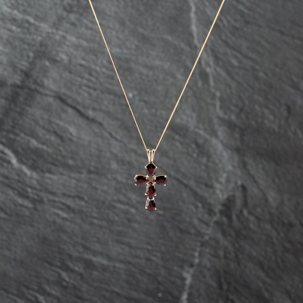 Second Hand 9ct Yellow Gold Pear Shape Garnet Claw Set Cross Pendant & 18 Inch Curb Chain 41142904 Second Hand 9ct Yellow Gold Pear Shape Garnet Claw Set Cross Pendant & 18 Inch Curb Chain 41142904