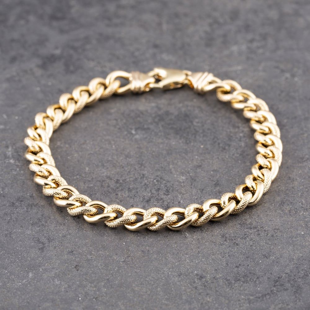9ct Yellow Gold Plain & Patterned Links 7.5 Inch Curb Chain Bracelet