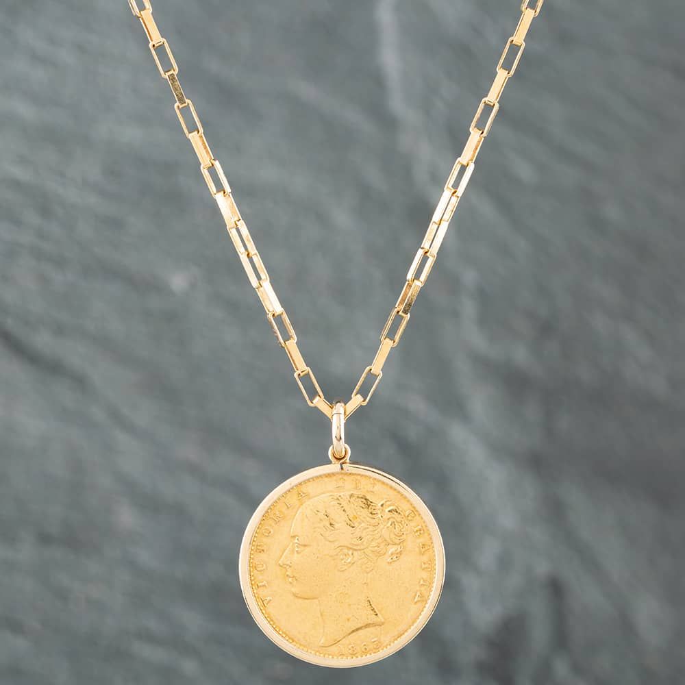 9ct Yellow Gold Queen Victoria 1863 Full Sovereign Pendant & 18 Inch Paper Link Chain