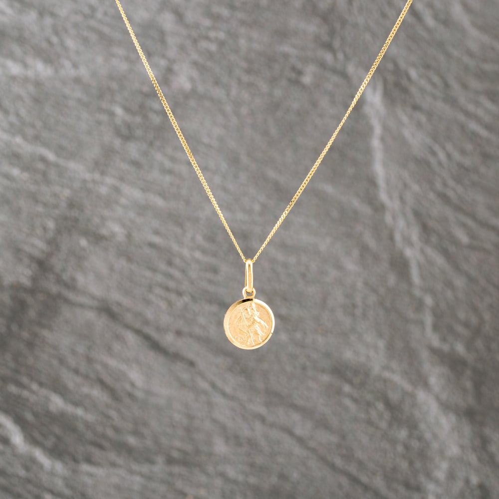 9ct Yellow Gold Round St Christopher Pendant & 16 Inch Curb Chain