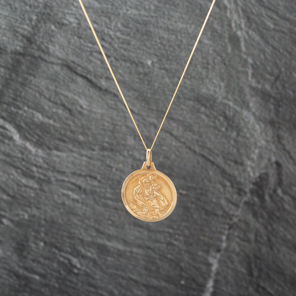 A larger 27mm round St Christopher medal crafted in 9ct yellow gold. With a 2.8g weight and detailed central iconography, this 18-inch curb chain pendant is a timeless choice for travellers and commuters alike.
