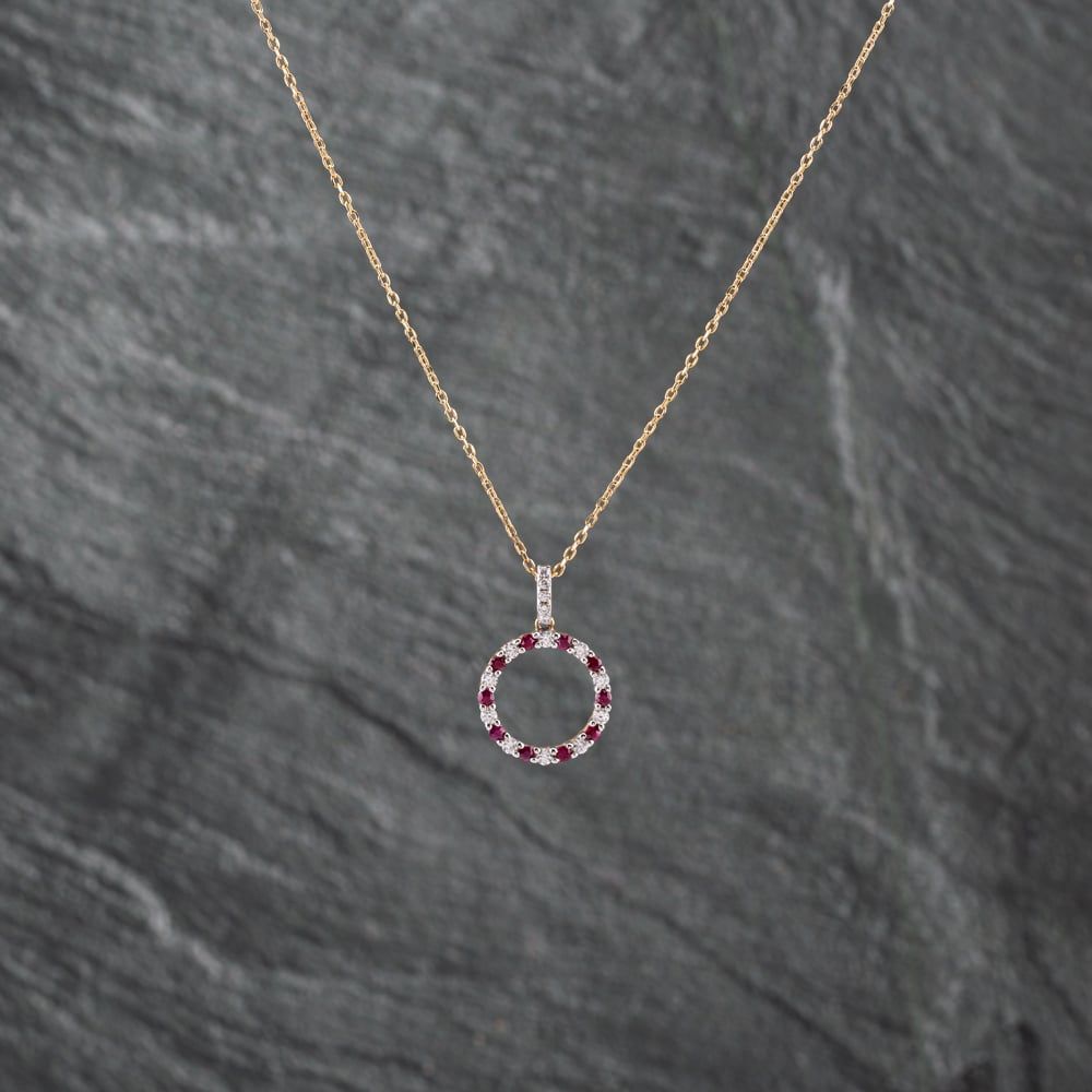 9ct Yellow Gold Ruby & Cubic Zirconia Open Circle Pendant & 18 Inch Trace Chain