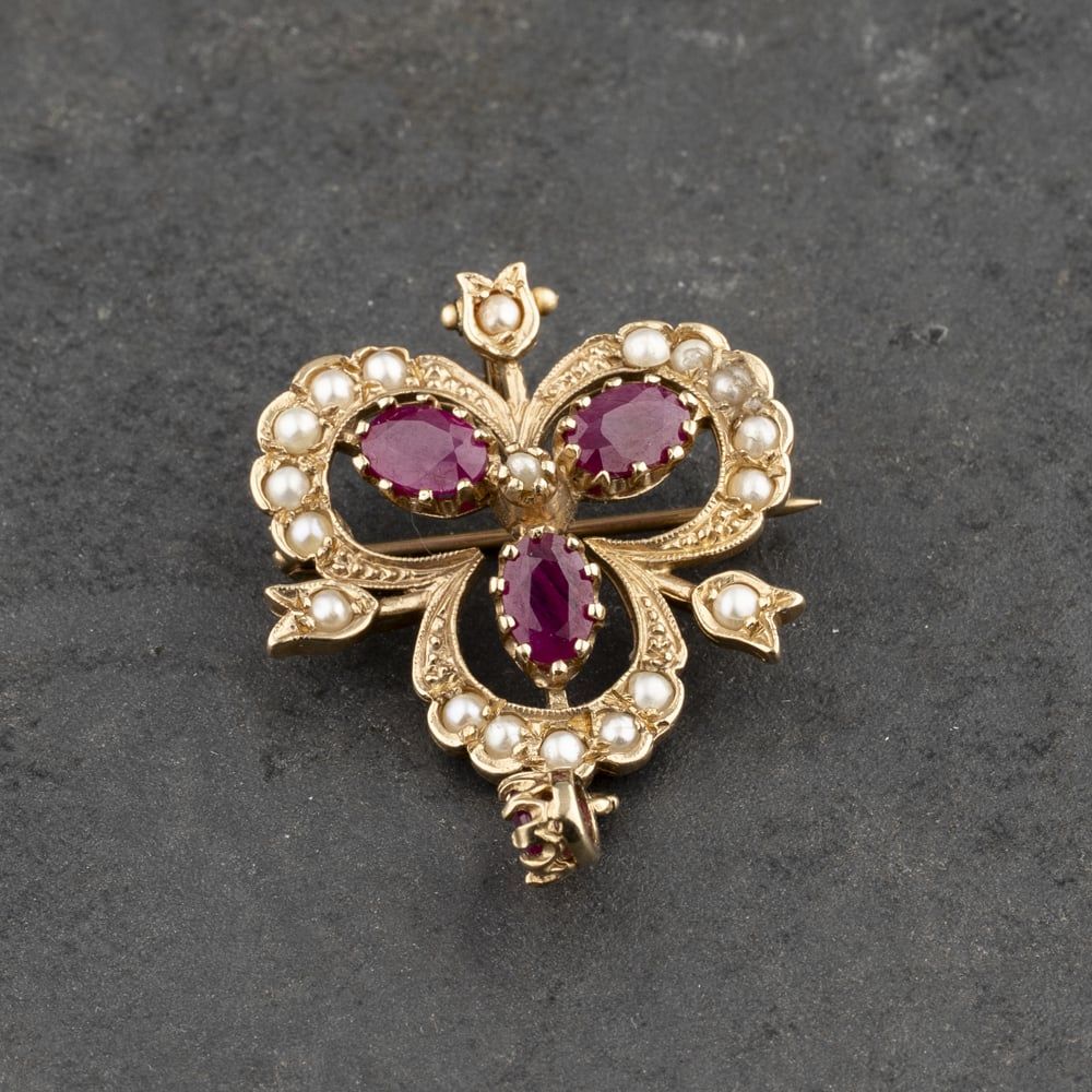 9ct Yellow Gold Ruby & Seed Pearl Clover Shape Brooch