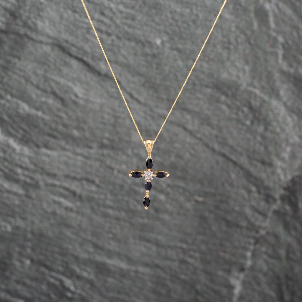 This delicate 1.4g cross combines the classic beauty of sapphires with a touch of diamond brilliance. Crafted in 9ct yellow gold and measuring 21.8mm, it is a graceful and precious piece suspended from an 18-inch curb chain.