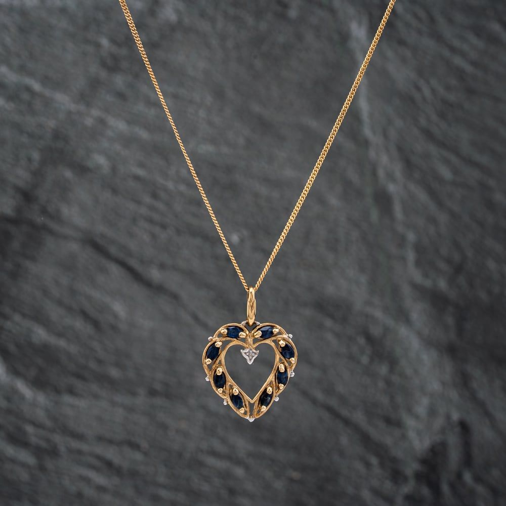 9ct Yellow Gold Sapphire & Diamond Open Heart Pendant & 18 Inch Curb Chain