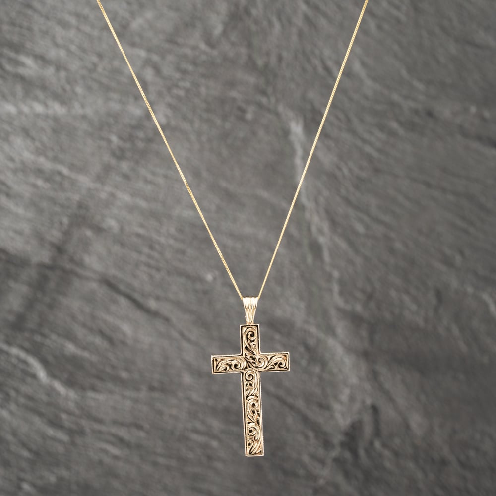 Second Hand 9ct Yellow Gold Scroll Engraved And Bark Textured Cross Pendant & 18 Inch Curb Chain 41142598 Second Hand 9ct Yellow Gold Scroll Engraved And Bark Textured Cross Pendant & 18 Inch Curb Chain 41142598