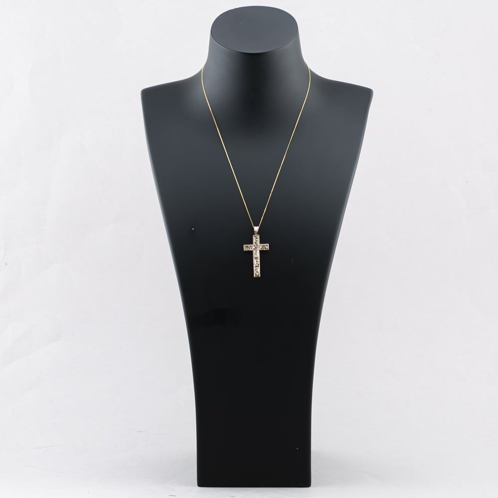 9ct Yellow Gold Scroll Engraved And Bark Textured Cross Pendant & 18 Inch Curb Chain