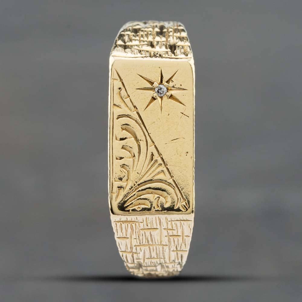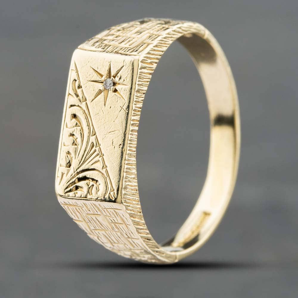 9ct Yellow Gold Single Cut Diamond Half Engraved Oblong Signet Ring