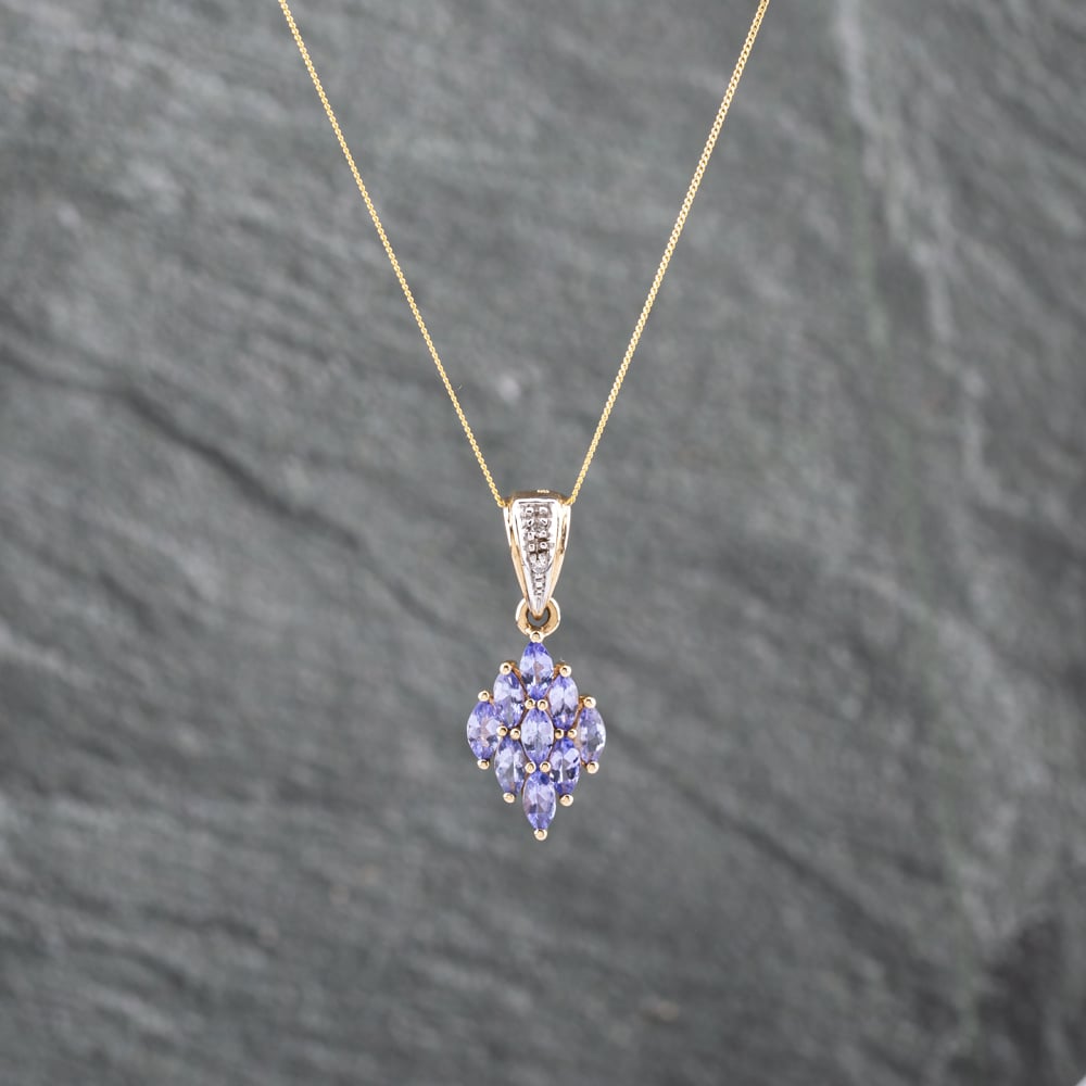 9ct Yellow Gold Tanzanite & Diamond Marquise Shaped Cluster Pendant & 18 Inch Curb Chain