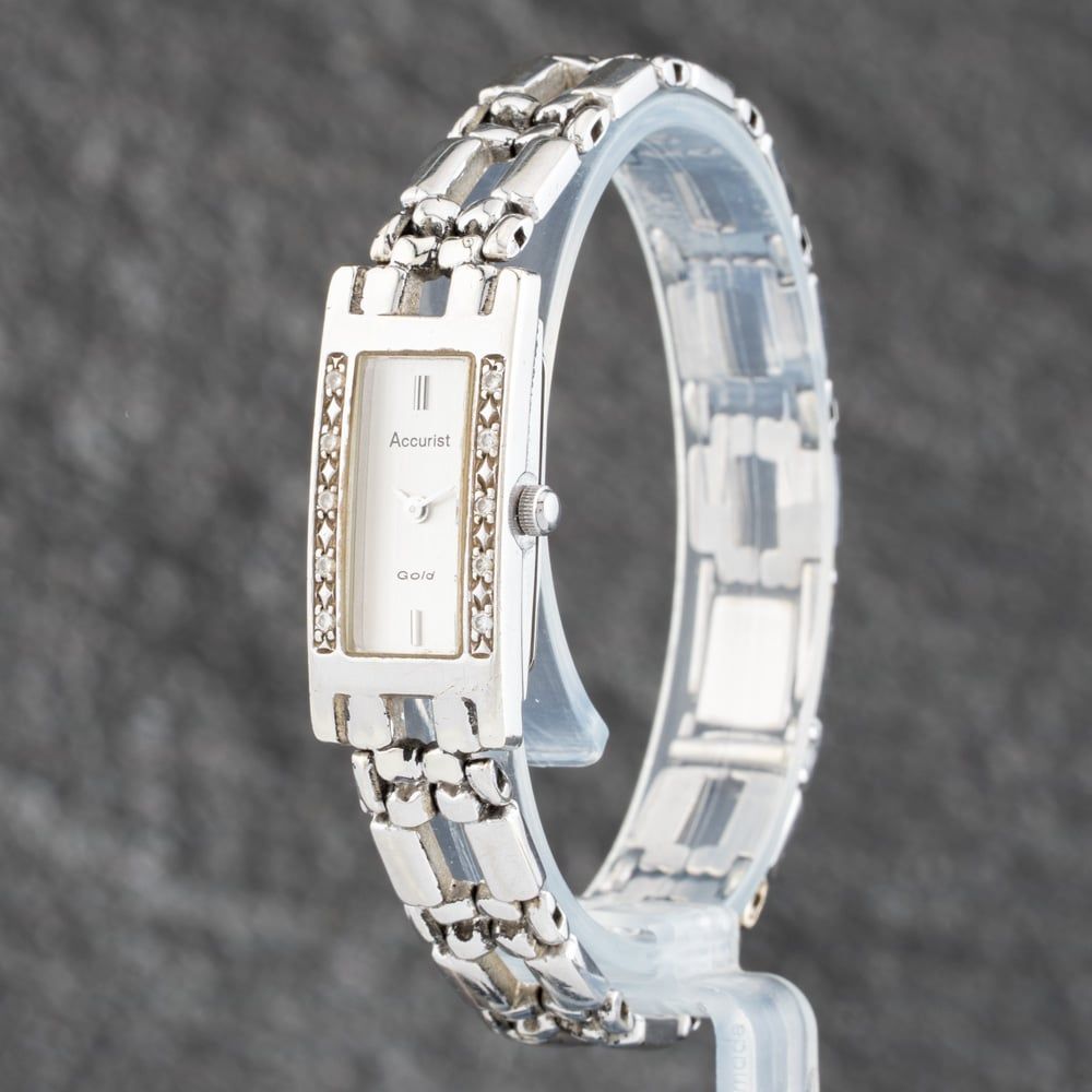The Accurist Diamond Watch combines an oblong shaped 9ct gold case and gold bracelet with a fold over clasp. The silver 13.0mm case measures 6.0mm thick and has a silver bezel with a snap off case back. The silver analogue dial is protected beneath mineral crystal glass and has baton hour markers. Power is generated by the quartz movement. The watch weighs 21.9 grams