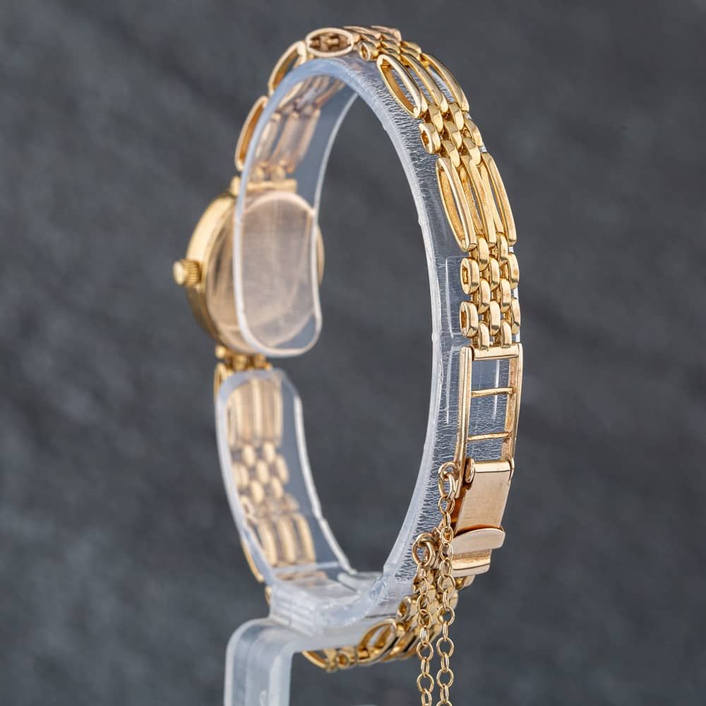 The Accurist Watch combines an oval shaped 9ct gold case and gold bracelet with a fold over clasp. The gold 16.0mm case measures 6.0mm thick and has a cream 9ct yellow gold fixed bezel with a snap off case back. The mother of pearl analogue dial is protected beneath mineral crystal glass and has baton hour markers. Power is generated by the quartz movement. The watch is set with diamonds and weighs 17.9 grams