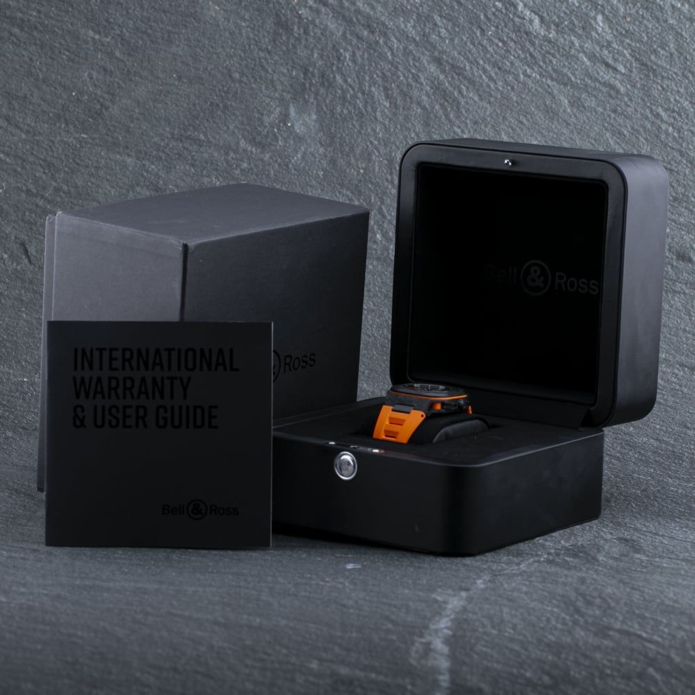 The limited edition Bell & Ross Limited Edition Br-X5 Carbon Orange Watch combines a square shaped carbon fibre case and orange rubber strap with a push button deployment clasp. The black 41.0mm case measures 13.0mm thick and has a black carbon fibre fixed bezel with a screwed in case back. The black analogue dial is protected beneath scratch resistant sapphire crystal glass and has baton hour markers, as well as luminescent hands, and a date display. Power is generated by the automatic movement. The watch weighs 109.1 grams and has a water resistance of up to 100 metres.