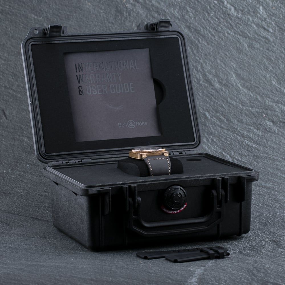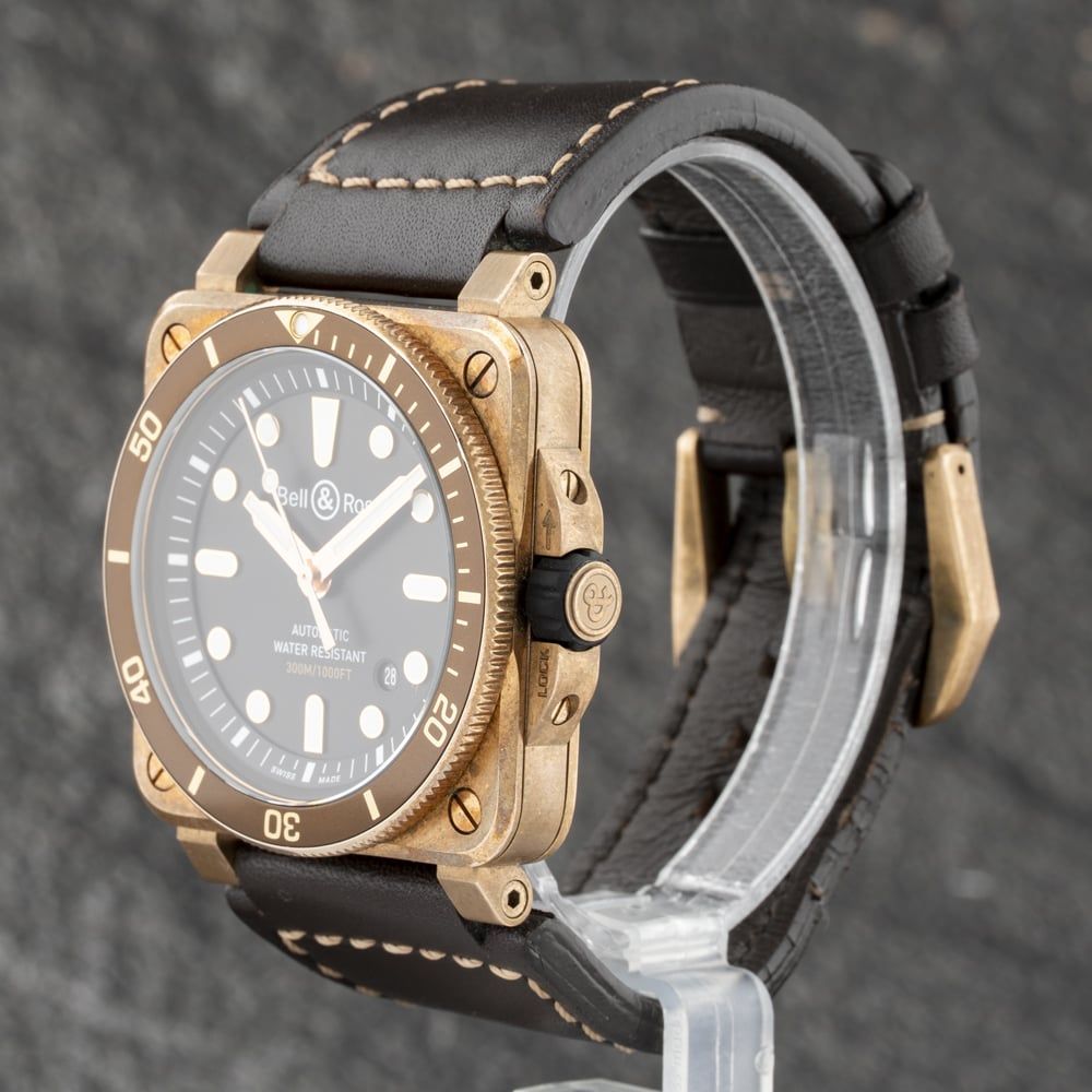 The limited edition Bell & Ross Limited Edition Diver Brown Bronze Watch combines a square shaped bronze case and brown leather strap with a traditional buckle. The gold 42.0mm case measures 12.0mm thick and has a bronze uni-directional rotating with a screwed in case back and a lug width of 24mm. The brown analogue dial is protected beneath scratch resistant sapphire crystal glass and has dot & baton hour markers, as well as luminescent hands, and a date display. Power is generated by the automatic movement with a power reserve of up to 40 hours. The watch weighs 142.4 grams and has a water resistance of up to 300 metres.