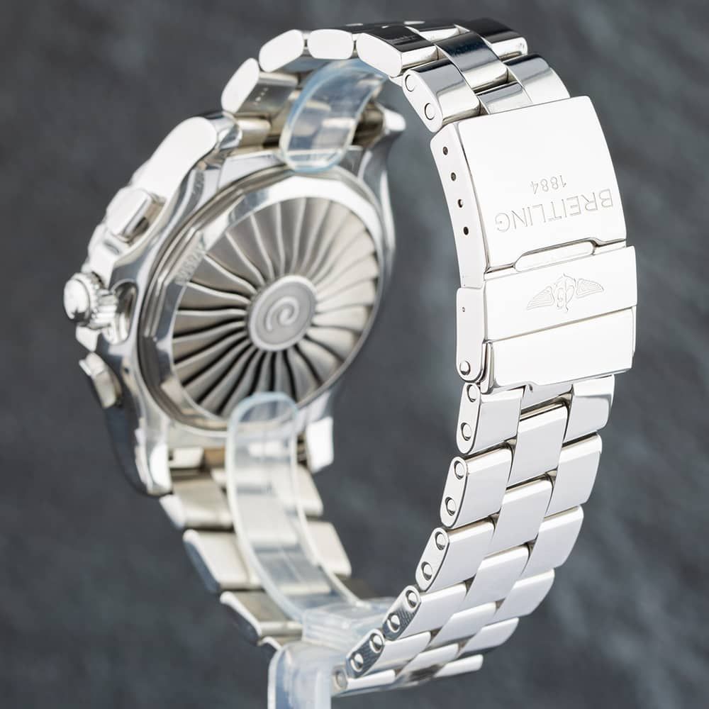 The Breitling Airwolf Watch is composed of a 44mm round shaped stainless steel case and silver stainless steel bracelet with a fold over clasp. It has a black dual display dial with alarm, a date display, chronograph sub-dials, luminescent dial hands, which is protected beneath scratch resistant sapphire crystal glass. Power is generated by the chronometer certified quartz movement. This model is also water resistant up to 50 metres.