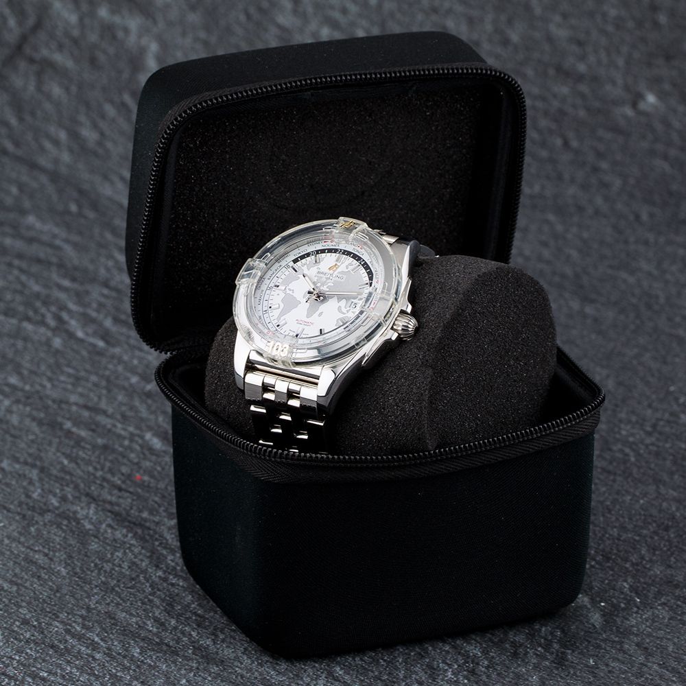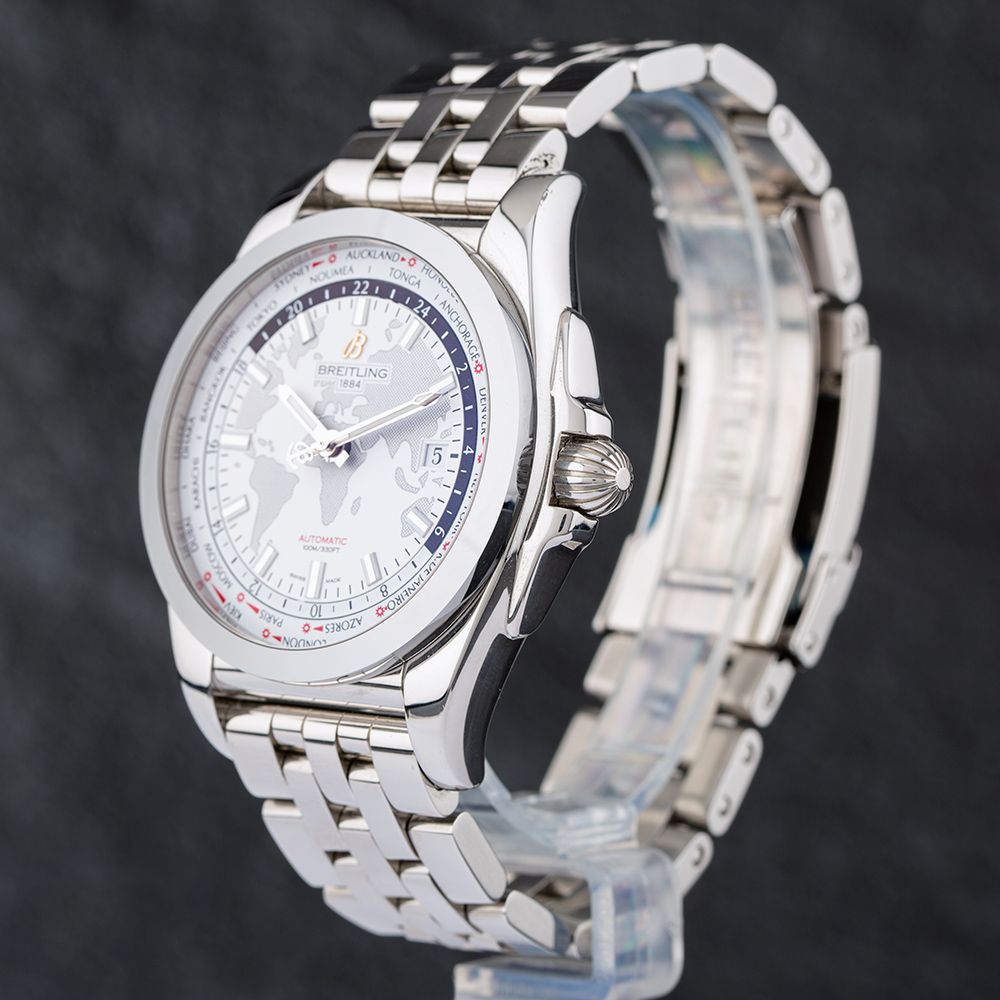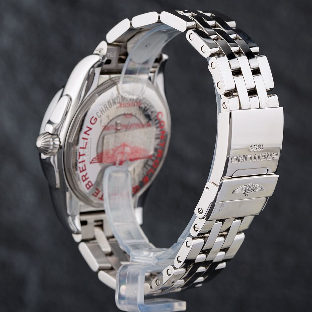 The Second Hand Breitling Galactic Unitime Bracelet Watch is composed of a 44mm round-shaped stainless steel case and silver stainless steel bracelet with a push button deployment clasp. It has a white analogue dial with a date display, and luminescent dial hands, protected beneath scratch-resistant sapphire crystal glass. Power is generated by the chronometer-certified automatic movement. This model is also water resistant up to 100 metres.