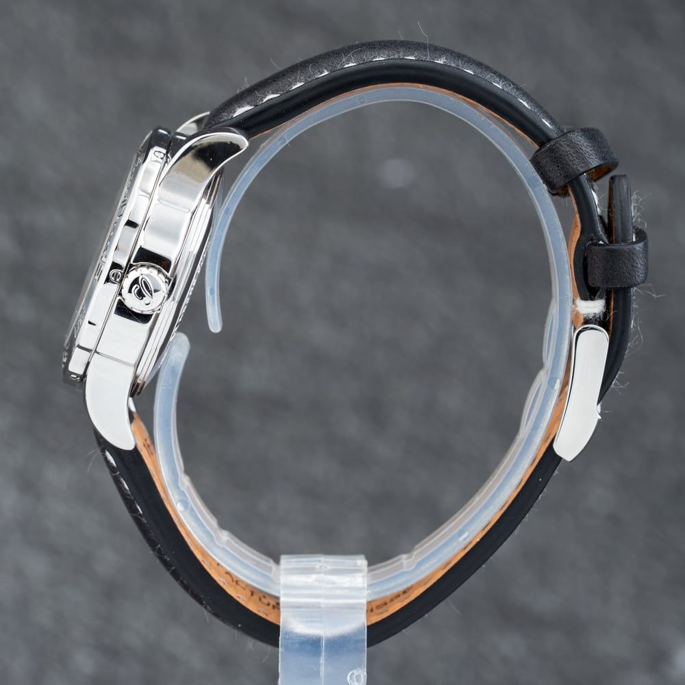 The Breitling Colt Watch combines a round shaped stainless steel case and black leather strap with a traditional buckle. The silver 33.0mm case measures 12.0mm thick and has a silver stainless steel uni-directional rotating bezel with a screwed in case back and a lug width of 16mm. The black analogue dial is protected beneath scratch resistant sapphire crystal glass and has arabic numerals & batons hour markers, as well as luminescent hands, and a date display. Power is generated by the chronometer certified quartz movement. The watch weighs 56.4 grams and has a water resistance of up to 500 metres.