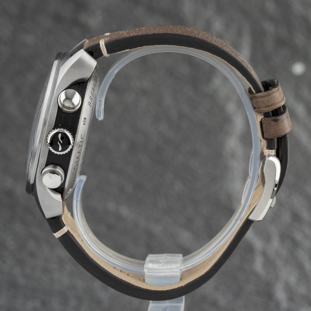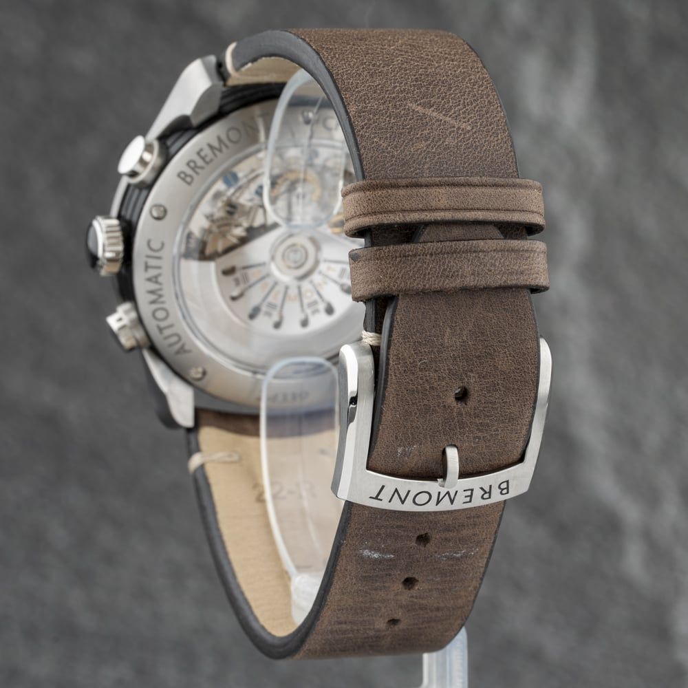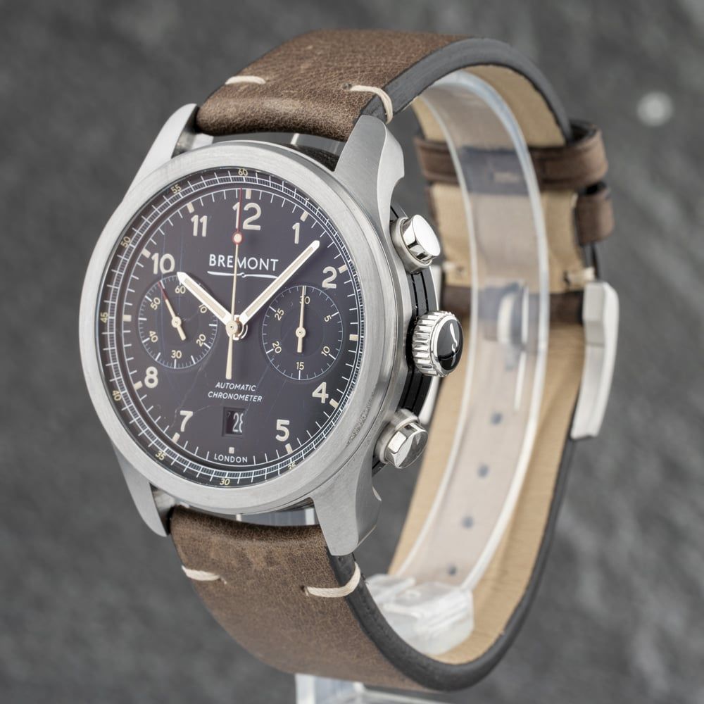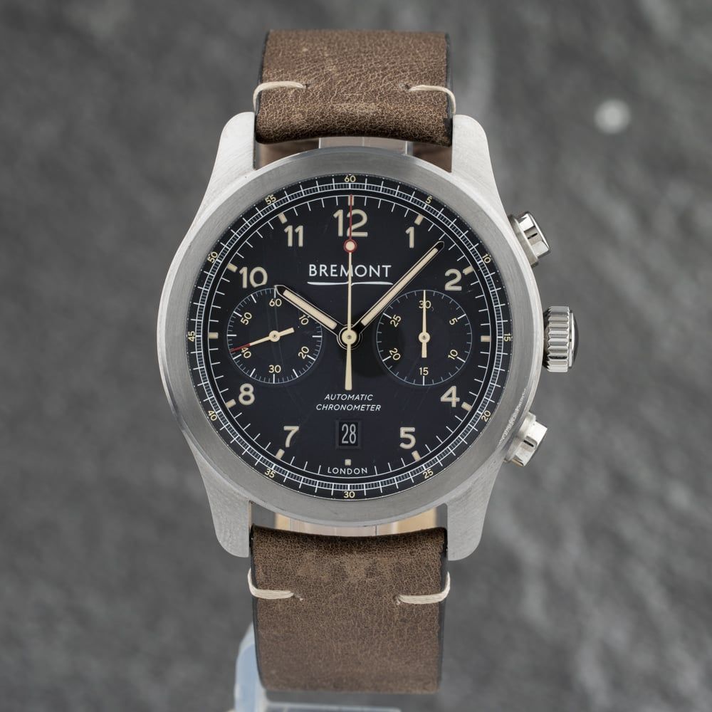 The Bremont ALT1-C Griffon honours the PR Mk XIX Spitfire—a variant piloted by the English brothers' father and now part of the Rolls-Royce collection. This model features a 43mm hardened stainless steel Trip-Tick case and is powered by the chronometer-rated BE-50AE automatic movement with a 42-hour power reserve. Designed for precision and durability, it showcases a black metal dial with Super-LumiNova hands and numerals and is complemented by a brown vintage leather strap.
