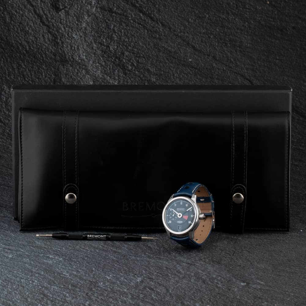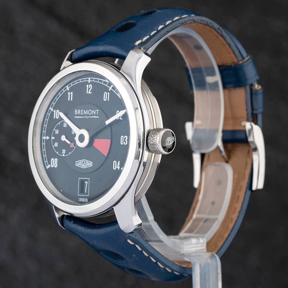 The JAGUAR MKI Black Dial Strap Watch BJ-I/BK is composed of a 43mm round shaped stainless steel case and blue leather strap with a traditional buckle. It has a black analogue dial with a date display, luminescent dial hands, which is protected beneath scratch resistant sapphire crystal glass. Power is generated by the chronometer certified automatic movement. This model is also water resistant up to 100 meters.