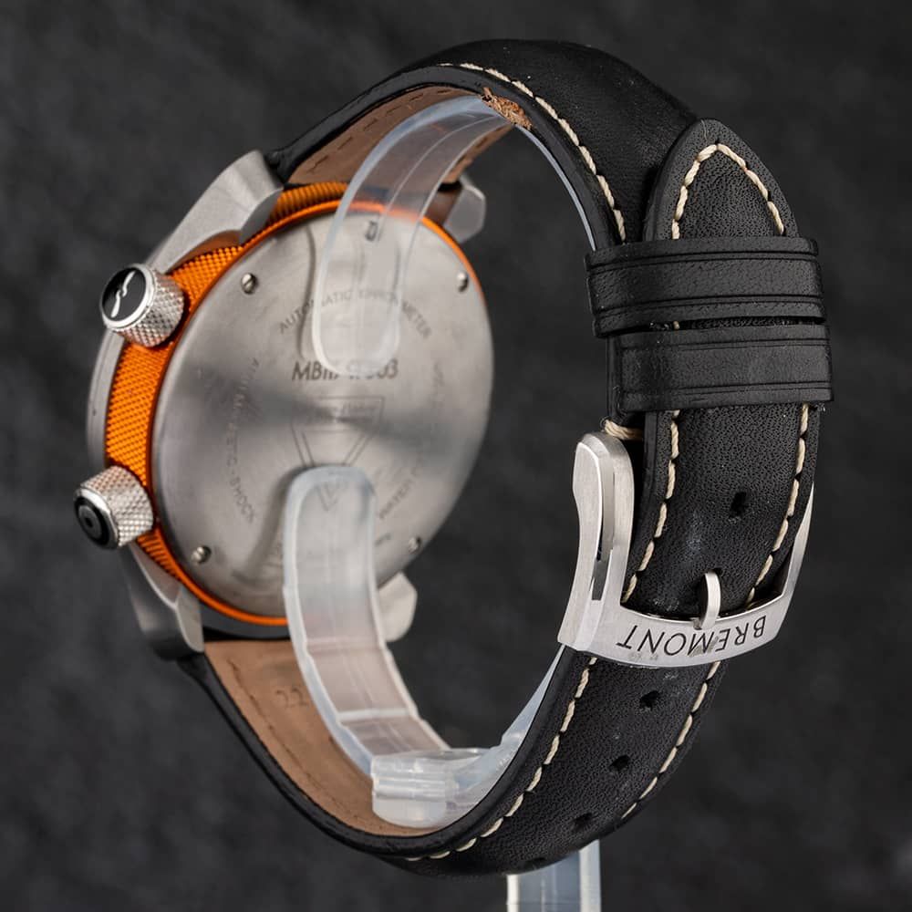 The MARTIN-BAKER II Orange Tone Black Dial Strap is composed of a 43mm round shaped stainless steel case and black leather strap with a traditional buckle. It has a black analogue dial with a date display, luminescent dial hands, which is protected beneath scratch resistant sapphire crystal glass. Power is generated by the chronometer certified automatic movement. This model is also water resistant up to 100 metres.