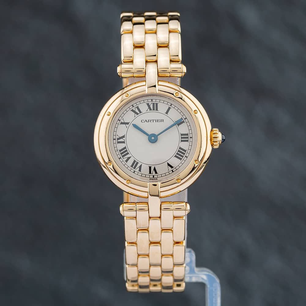 The Cartier Panthere Vendome Watch is composed of a 24mm round shaped 18ct gold case and gold bracelet with a fold over clasp. It has a white analogue dial, which is protected beneath scratch resistant sapphire crystal glass. Power is generated by the quartz movement. This model is also splash resistant.