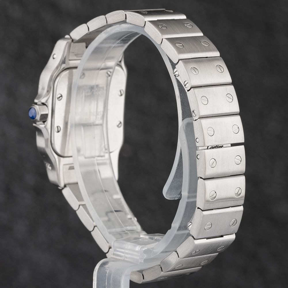 The Cartier Santos Galbee Watch is composed of a 24mm square shaped stainless steel case and silver stainless steel bracelet with a fold over clasp. It has a white analogue dial, which is protected beneath scratch resistant sapphire crystal glass. Power is generated by the quartz movement. This model is also splash resistant.