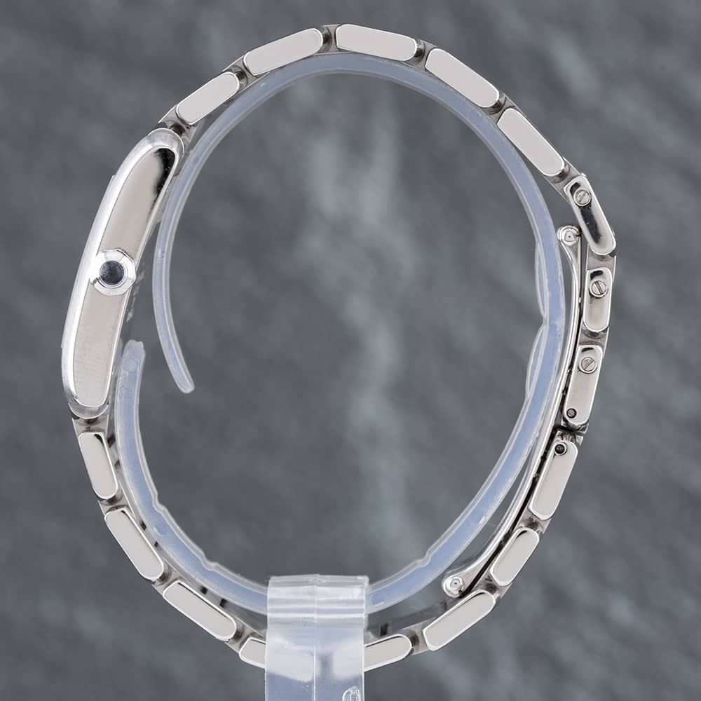 The Cartier Tank Francaise Watch combines a square shaped stainless steel case and silver stainless steel bracelet with a fold over clasp. The silver 25.0mm case measures 6.0mm thick and has a silver stainless steel bezel with a screwed in case back. The white analogue dial is protected beneath scratch resistant sapphire crystal glass and has roman numeral hour markers. Power is generated by the quartz movement. The watch weighs 80.8 grams and has a water resistance of up to 30 metres.