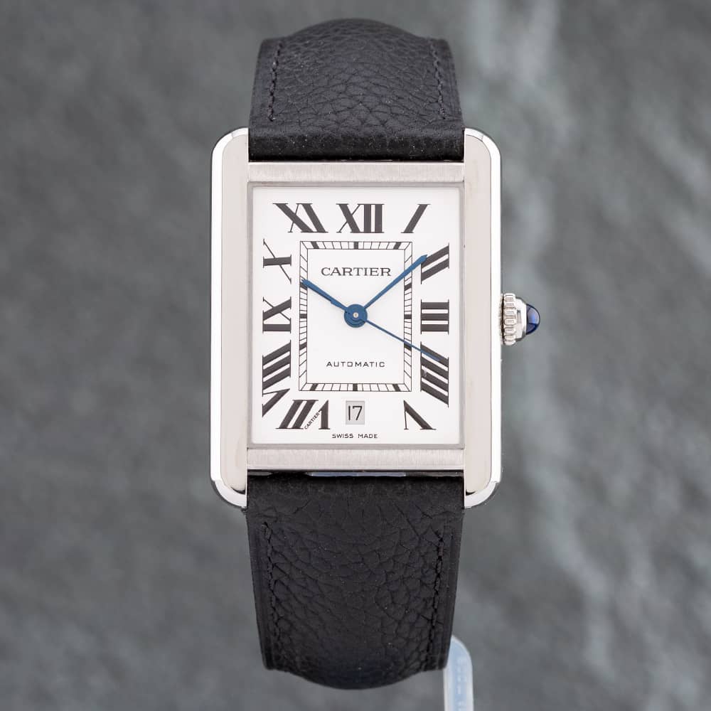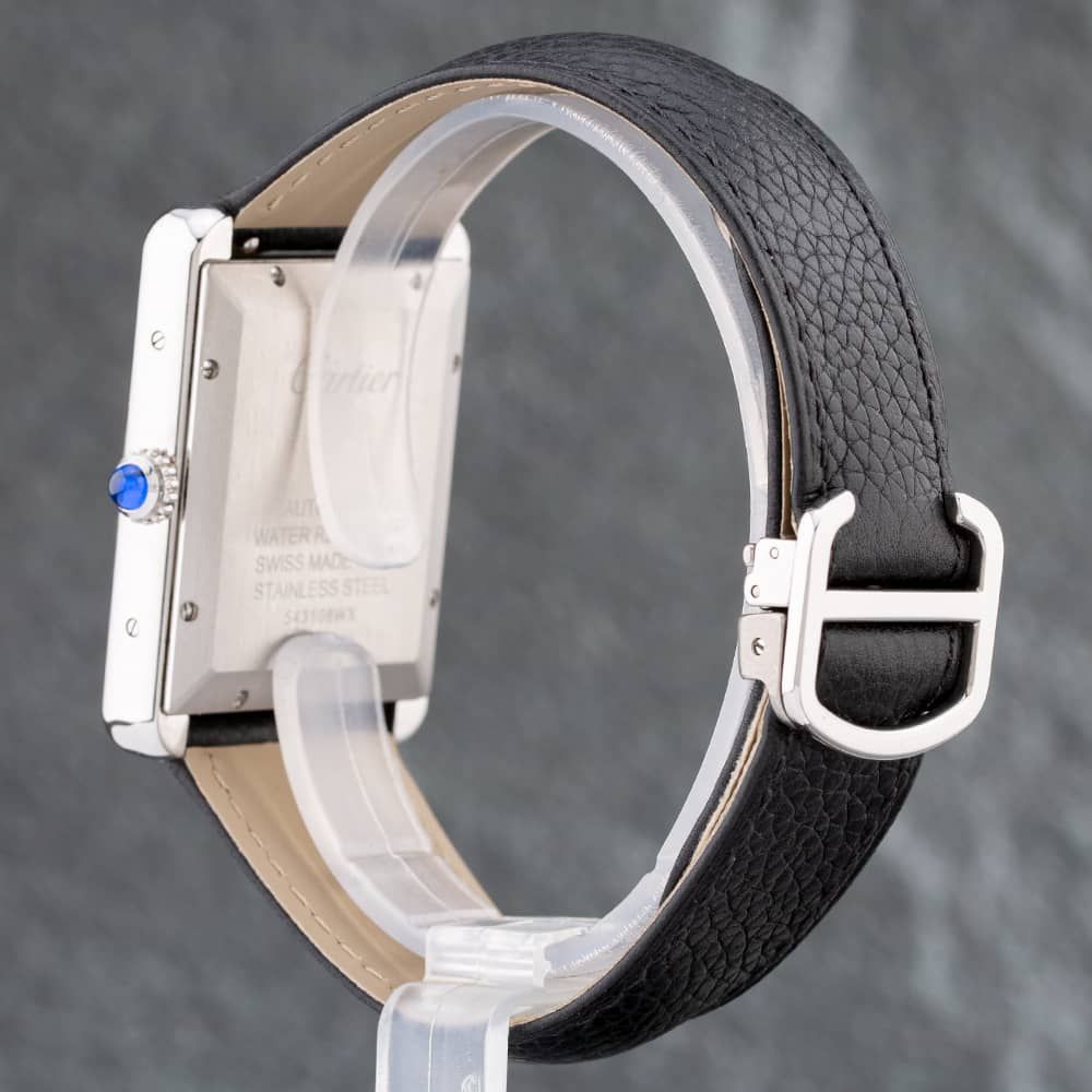 The Cartier XL Tank Solo Watch combines an oblong shaped stainless steel case and black leather strap with a push button deployment clasp. The silver 31.0mm case measures 7.0mm thick and has a silver stainless steel fixed bezel with a screwed in case back and a lug width of 22mm. The white analogue dial is protected beneath scratch resistant sapphire crystal glass and has roman numeral hour markers, as well as a date display. Power is generated by the automatic movement. The watch weighs 58.1 grams