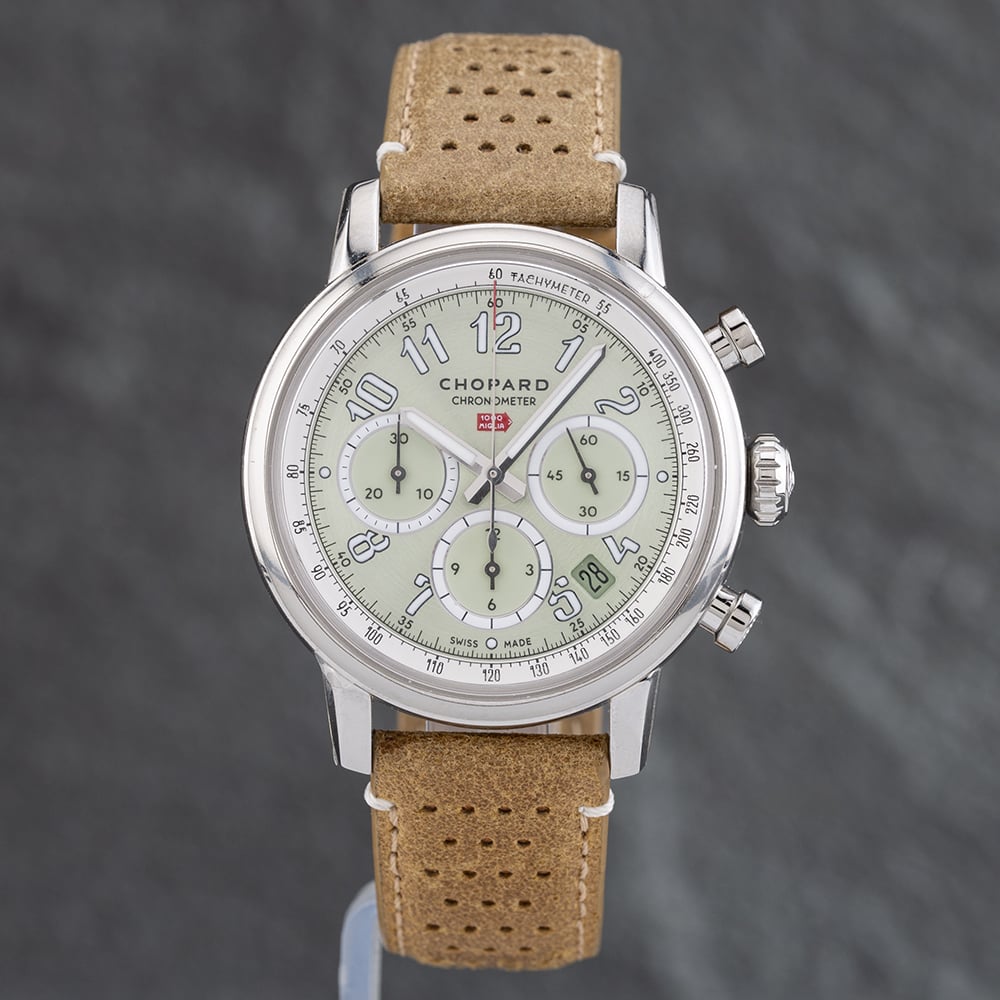 The Chopard Mille Miglia Watch combines a round shaped stainless steel case and brown leather strap with a traditional buckle. The silver 40.0mm case measures 12.0mm thick and has a silver stainless steel fixed bezel with a sapphire crystal case back and a lug width of 18mm. The green analogue dial is protected beneath scratch resistant sapphire crystal glass and has arabic numeral hour markers, as well as a date display. Power is generated by the chronometer certified automatic movement with 37 jewels and a power reserve of up to 54 hours. The watch weighs 81.5 grams and has a water resistance of up to 50 metres.
