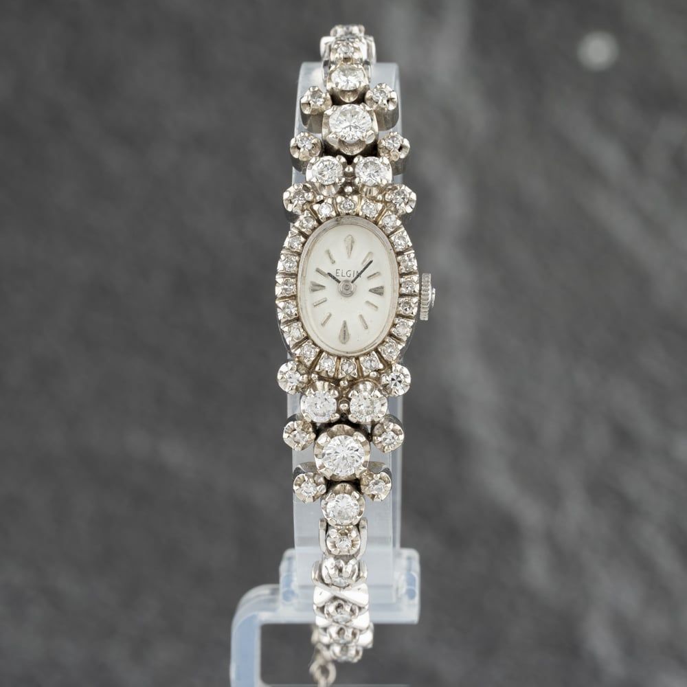 The Elgin Diamond 2.52Ct White Gold Vintage Watch combines an oval shaped 14ct gold case and silver gold bracelet with a fold over clasp. The silver 15.0mm case measures 6.0mm thick and has a silver fixed bezel with a snap off case back. The cream analogue dial is protected beneath plastic and has baton hour markers. Power is generated by the mechanical movement. The watch is set with diamonds and weighs 28 grams