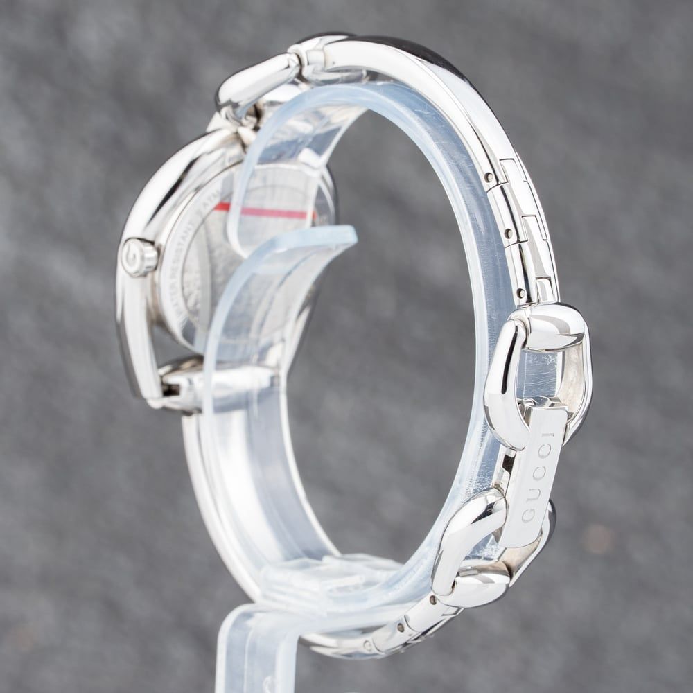 The Gucci Horsebit Watch combines a round shaped stainless steel case and silver stainless steel bracelet with a fold over clasp. The silver 28.0mm case measures 6.0mm thick and has a silver stainless steel fixed bezel with a snap off case back. The mother of pearl analogue dial is protected beneath scratch resistant sapphire crystal glass and has roman numeral hour markers. Power is generated by the quartz movement. The watch weighs 42.6 grams and has a water resistance of up to 30 metres.