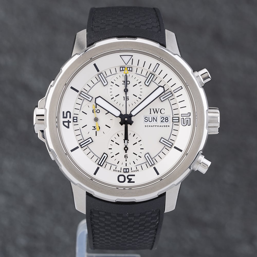 The IWC Aquatimer Watch combines a round shaped stainless steel case and black rubber strap with a traditional buckle. The silver 44.0mm case measures 15.0mm thick and has a silver stainless steel fixed bezel with a screwed in case back and a lug width of 22mm. The white analogue dial is protected beneath scratch resistant sapphire crystal glass and has arabic numerals & batons hour markers, as well as luminescent hands, a date display, and chronograph function. Power is generated by the automatic movement. The watch weighs 173 grams and has a water resistance of up to 300 metres.