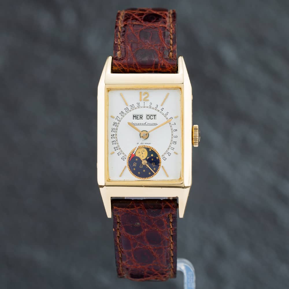 This rare limited edition Jaeger-LeCoultre watch (No. 000 of 600) was created for the brand’s 150th anniversary. It features a 24mm oblong 18ct yellow gold case, white dial with moon phase and date display, and a brown leather strap with traditional buckle. Powered by a mechanical movement and protected by mineral crystal glass, it’s also splash resistant. Includes a Jaeger-LeCoultre Archives Certificate.