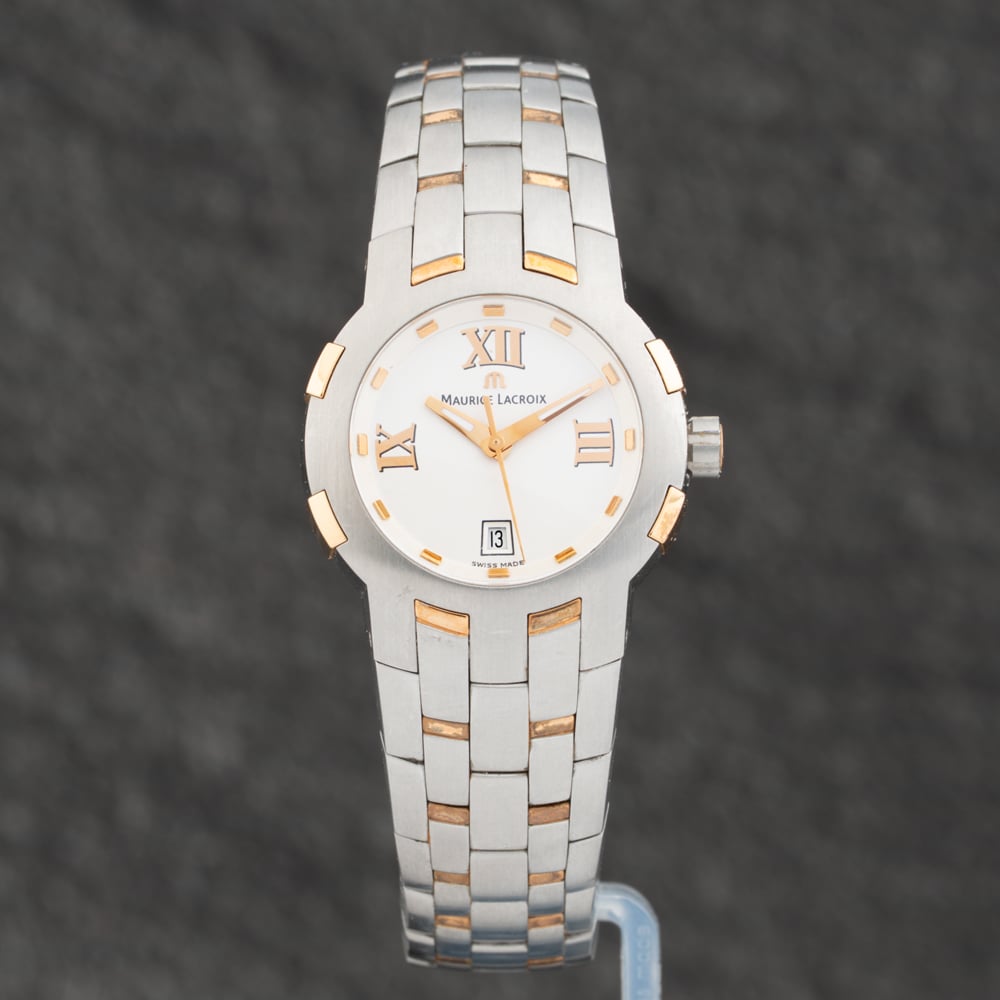 The Maurice Lacroix Mens Classique Bracelet Watch combines a round shaped mixed metal case and silver stainless steel bracelet with a push button deployment clasp. The multi-coloured 28.0mm case measures 8.0mm thick and has a silver stainless steel fixed bezel with a screwed in case back. The white analogue dial is protected beneath scratch resistant sapphire crystal glass and has roman numeral hour markers, as well as luminescent hands, and a date display. Power is generated by the quartz movement. The watch weighs 108.4 grams and has a water resistance of up to 100 metres.