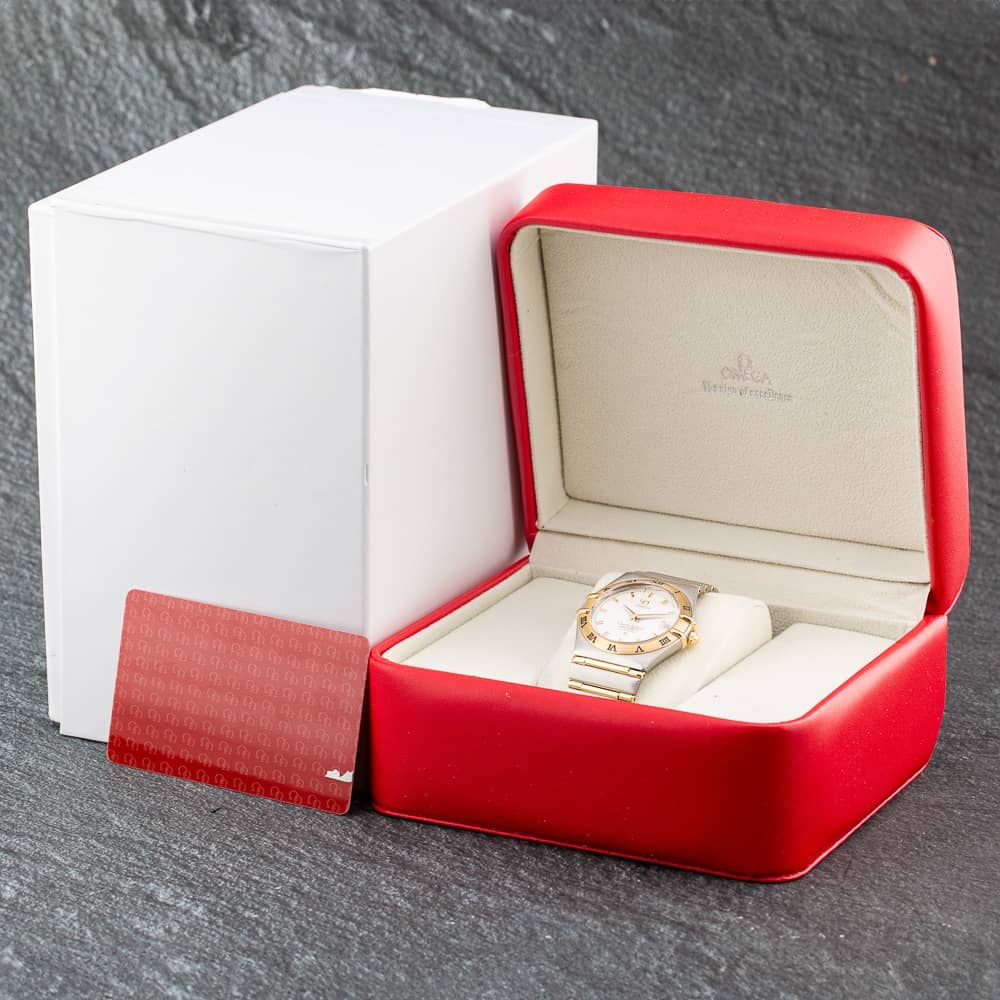 Batch 448 The OMEGA Constellation Watch is composed of a 35.0mm round shaped stainless steel case and two colour stainless steel bracelet with a push button deployment clasp. It has a white analogue dial with a date display, luminescent dial hands, which is protected beneath scratch resistant sapphire crystal glass. Power is generated by the chronometer certified automatic movement. This model is also water resistant up to 50 metres.