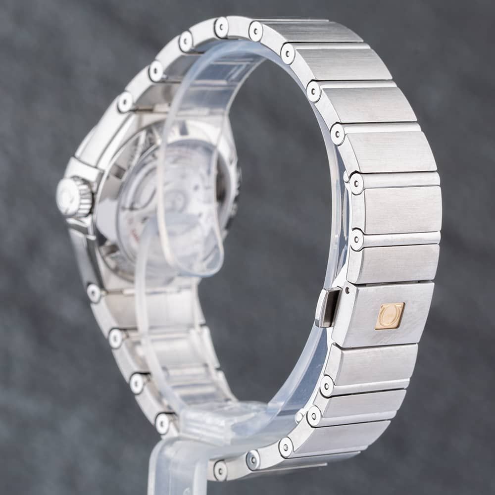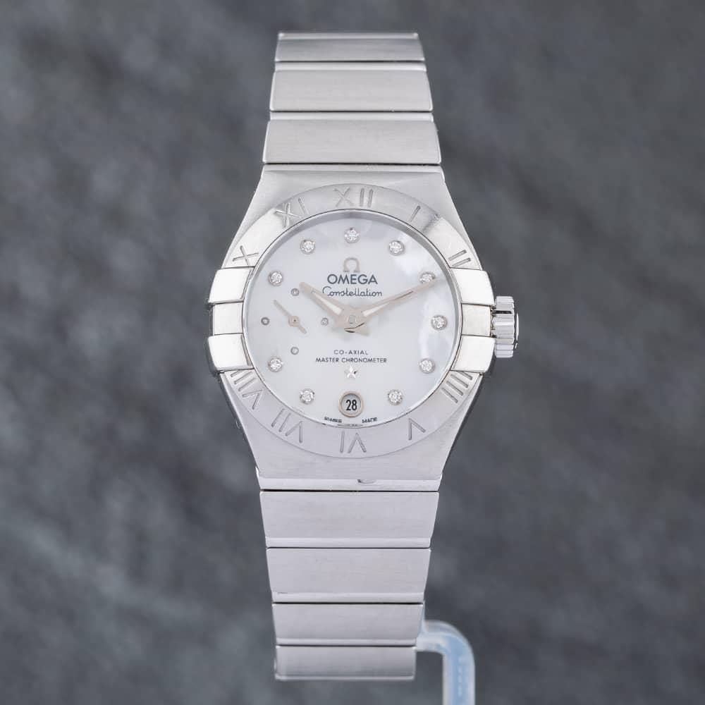 The OMEGA Constellation Watch combines a round shaped stainless steel case and silver stainless steel bracelet with a push button deployment clasp. The silver 27.0mm case measures 12.0mm thick and has a silver stainless steel fixed bezel with a sapphire crystal case back. The mother of pearl analogue dial is protected beneath scratch resistant sapphire crystal glass and has diamond hour markers, as well as luminescent hands, and a date display. Power is generated by the chronometer certified automatic movement. The watch is set with diamonds and weighs 91.4 grams. This model also has a water resistance of up to 100 metres.