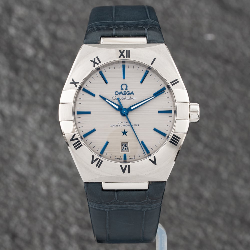 The OMEGA Constellation Watch combines a round shaped stainless steel case and blue leather strap with a push button deployment clasp. The silver 39.0mm case measures 12.0mm thick and has a silver stainless steel fixed bezel with a sapphire crystal case back. The grey analogue dial is protected beneath scratch resistant sapphire crystal glass and has baton hour markers, as well as luminescent hands, and a date display. Power is generated by the chronometer certified automatic movement with a power reserve of up to 55 hours. The watch weighs 91.4 grams and has a water resistance of up to 50 metres.