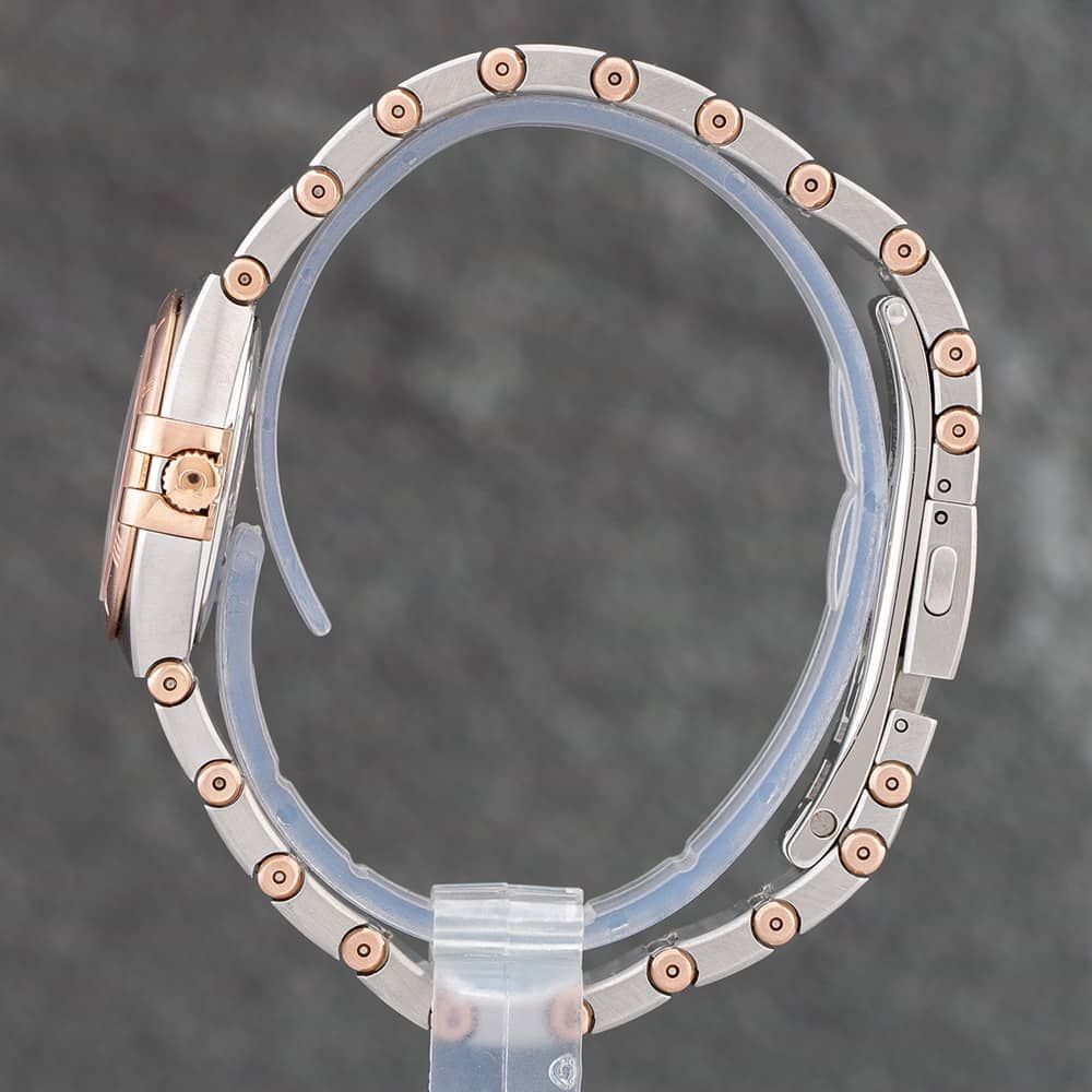 The OMEGA Constellation Watch combines a round shaped stainless steel case and two colour stainless steel bracelet with a push button deployment clasp. The silver 26.0mm case measures 8.0mm thick and has a rose gold 18ct rose gold fixed bezel with a snap off case back and a lug width of 15mm. The mother of pearl analogue dial is protected beneath scratch resistant sapphire crystal glass and has baton hour markers. Power is generated by the quartz movement. The watch weighs 75.4 grams and has a water resistance of up to 30 metres.