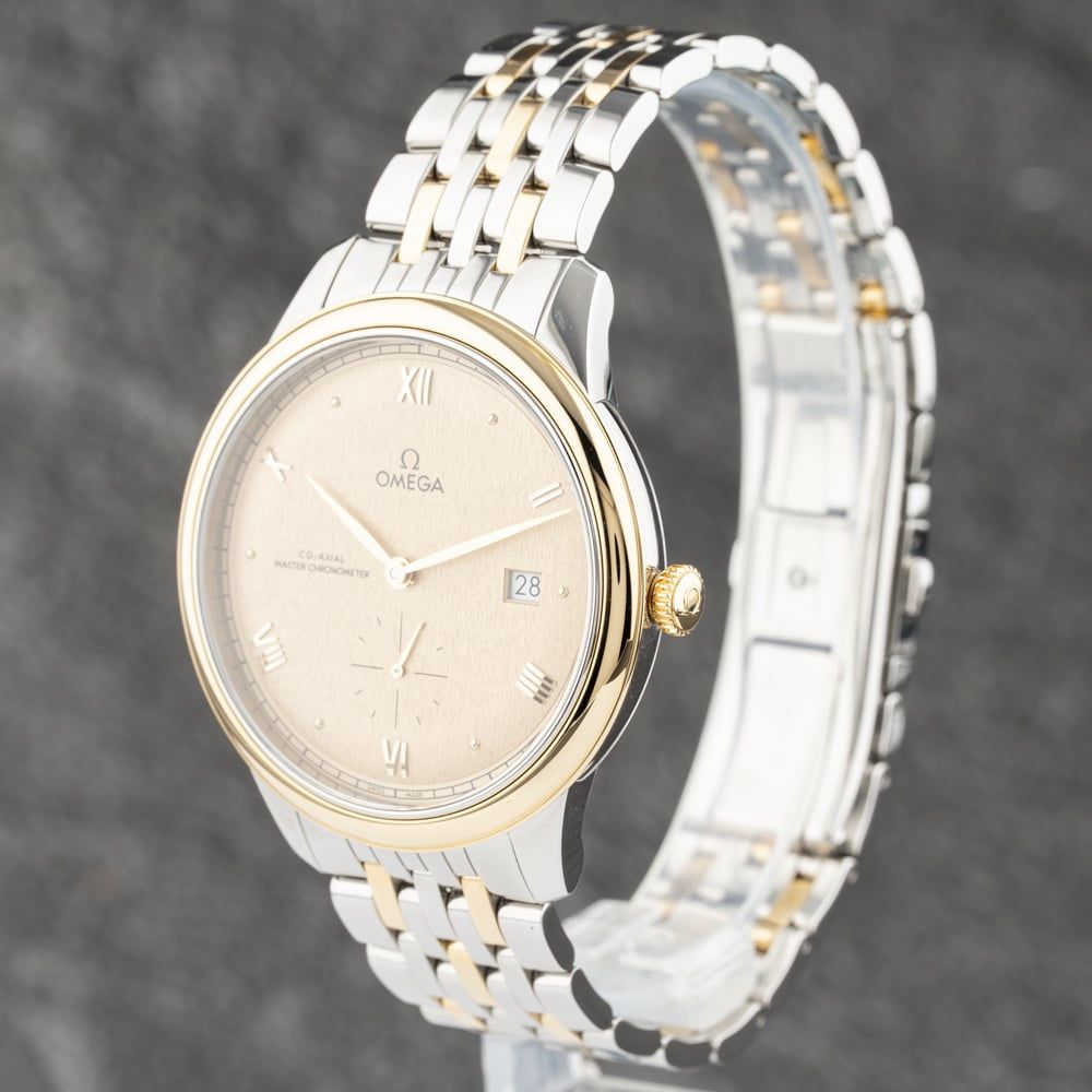The OMEGA De Ville Prestige Watch combines a round shaped stainless steel case and silver stainless steel bracelet with a push button deployment clasp. The silver 41.0mm case measures 10.0mm thick and has a gold stainless steel fixed bezel with a sapphire crystal case back and a lug width of 19mm. The champagne analogue dial scratch resistant sapphire crystal glass as well as a date display. Power is generated by the chronometer certified automatic movement with a power reserve of up to 55 hours. The watch weighs 125.3 grams and has a water resistance of up to 30 metres.