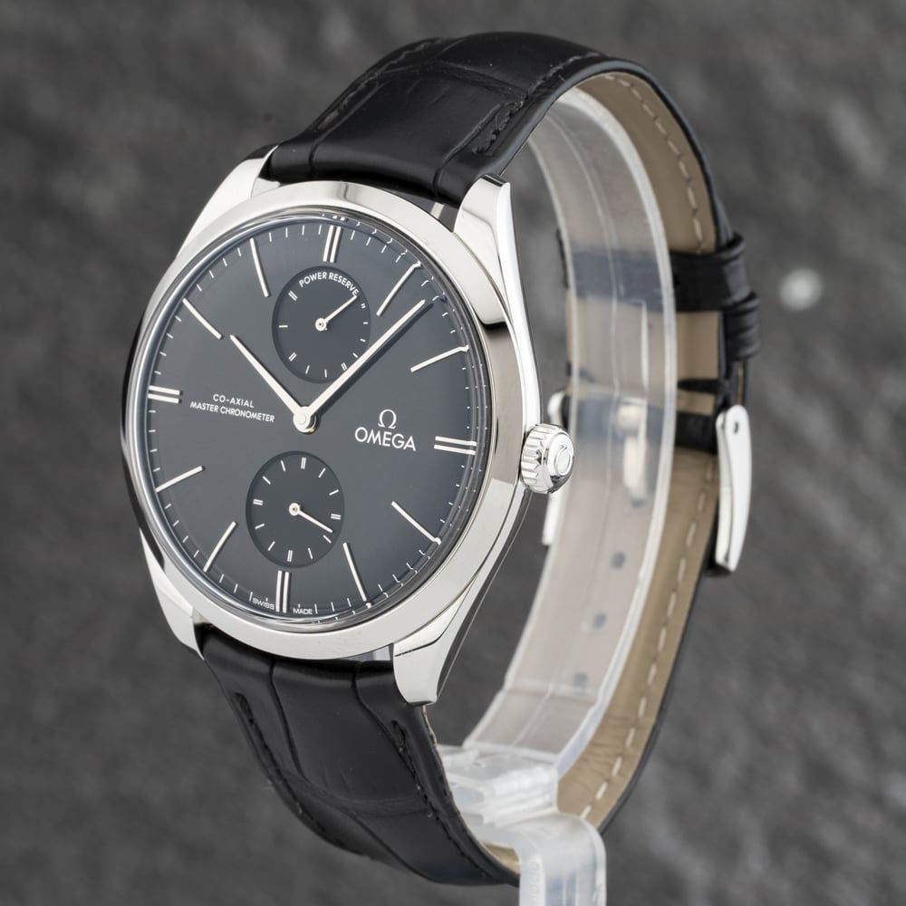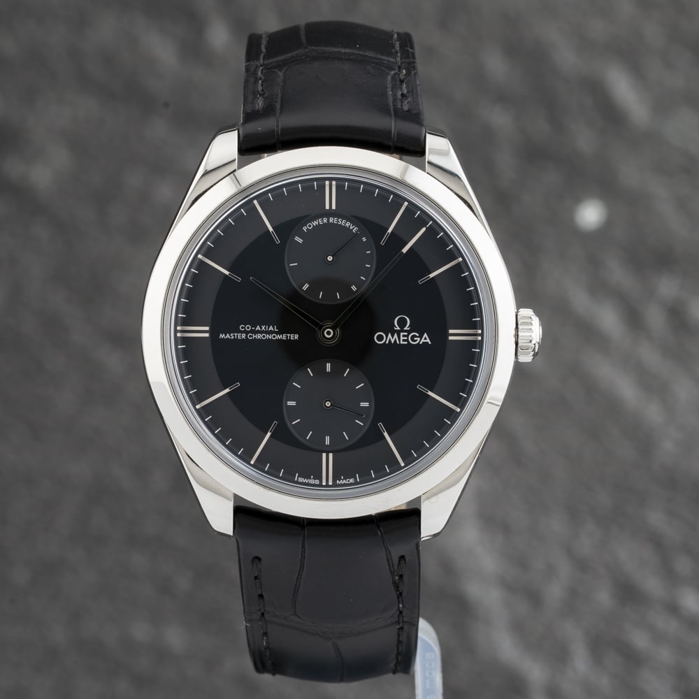 The OMEGA De Ville Watch combines a round shaped stainless steel case and black leather strap with a traditional buckle. The silver 40.0mm case measures 10.0mm thick and has a silver stainless steel fixed bezel with a sapphire crystal case back and a lug width of 20mm. The black analogue dial is protected beneath scratch resistant sapphire crystal glass and has baton hour markers. Power is generated by the chronometer certified automatic movement with a power reserve of up to 72 hours. The watch weighs 59.6 grams and has a water resistance of up to 30 metres.
