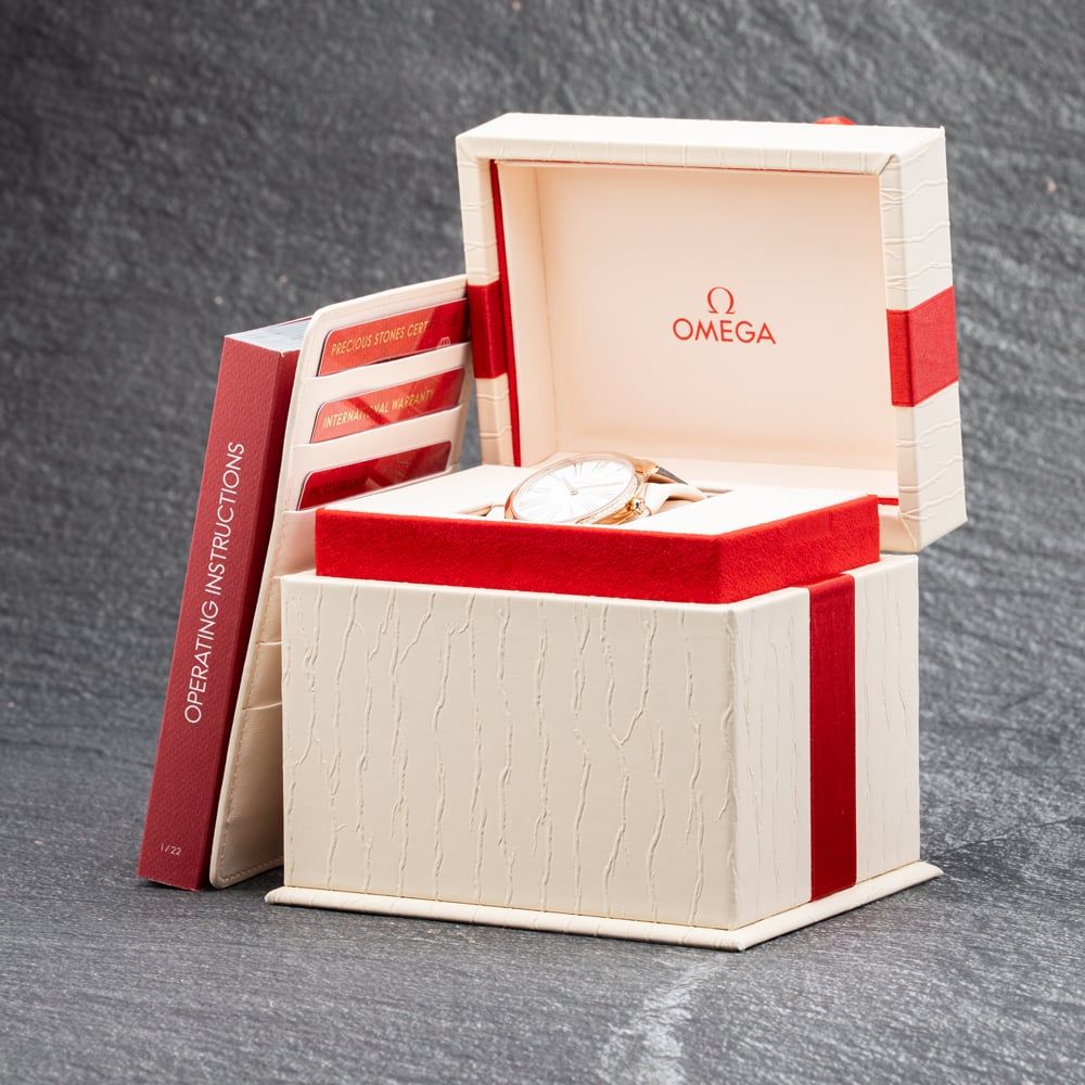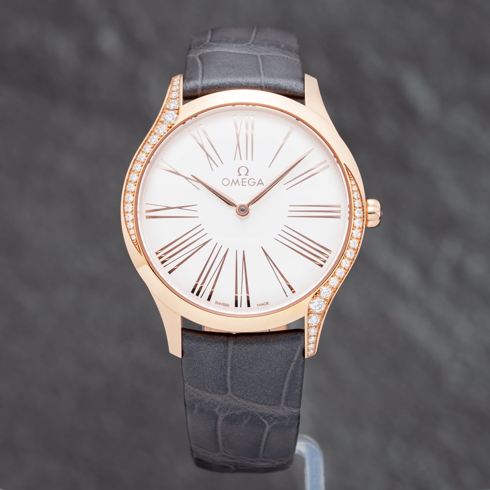 The OMEGA Ladies De Ville Tresor Watch combines a round shaped 18ct rose gold case and grey leather strap with a traditional buckle. The rose gold 36.0mm case measures 9.0mm thick and has a rose gold 18ct rose gold fixed bezel with a snap off case back and a lug width of 18mm. The white analogue dial is protected beneath scratch resistant sapphire crystal glass and has roman numeral hour markers. Power is generated by the quartz movement. The watch is set with diamonds and weighs 55 grams. This model also has a water resistance of up to 30 metres.