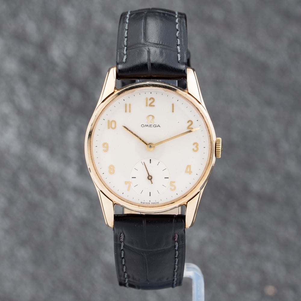 The OMEGA Vintage Watch combines a round shaped 9ct gold case and black leather strap with a traditional buckle. The gold 34.0mm case measures 9.0mm thick and has a gold 9ct yellow gold fixed bezel with a snap off case back and a lug width of 18mm. The white analogue dial is protected beneath plastic and has arabic numeral hour markers. Power is generated by the mechanical movement. The watch weighs 39 grams