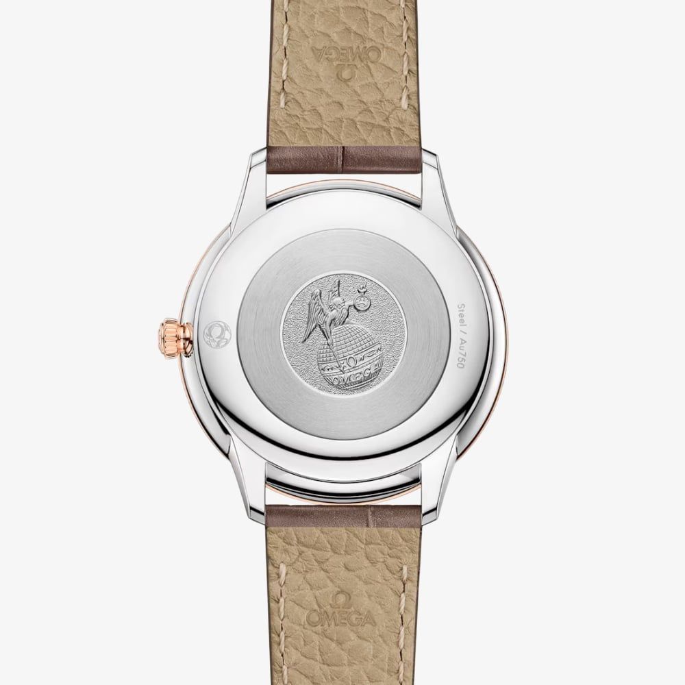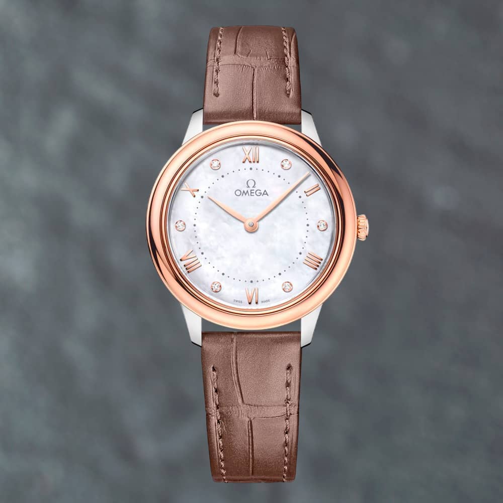 The OMEGA Prestige Diamond Dot Dial Watch combines a round shaped stainless steel case and brown leather strap with a traditional buckle. The silver 30.0mm case has a rose gold 18ct rose gold fixed bezel with a snap off case back. The mother of pearl analogue dial is protected beneath scratch resistant sapphire crystal glass and has diamond & roman numeral hour markers. Power is generated by the quartz movement. is set with diamonds and. This model also has a water resistance of up to 30 metres.