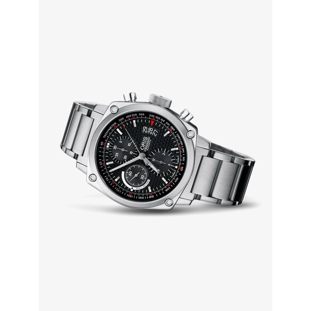 The BC4 Chronograph combines a 42.7mm stainless steel case and bracelet with a black triangular patterned dial. Domed sapphire crystal with an anti-reflective coating inside protects the dial, which has Superluminova coated hands, chronograph sub-dials, a date display, and a tachymeter. Powering the watch is the Oris 674 automatic movement with 25 jewels and a 48 hour power reserve, which can be seen through the mineral glass case back.