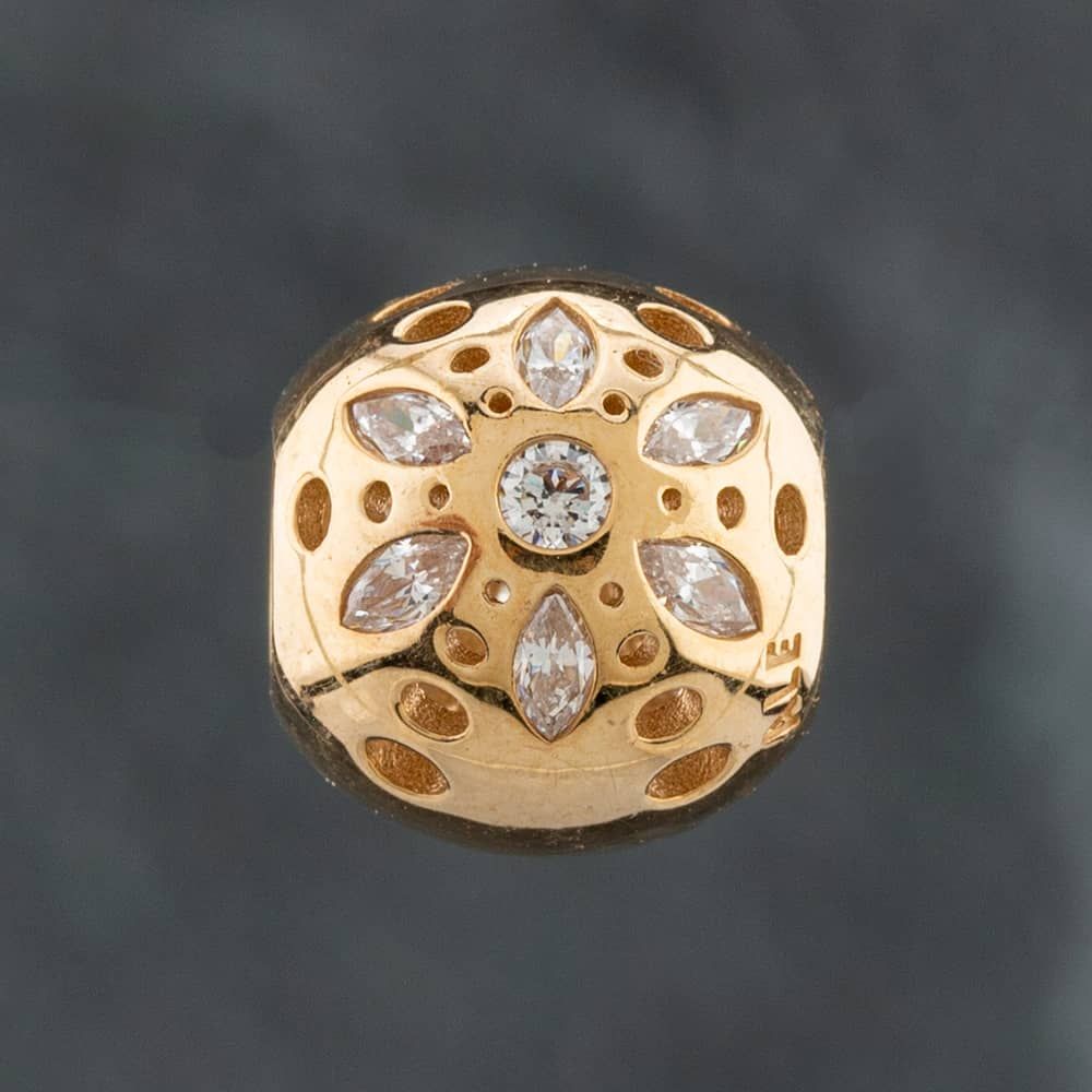 Adorn your bracelet with this luxurious 14ct gold bead from the new Pandora Christmas 2014 Collection. The gorgeous smooth gold design is adorned with a classy-looking bloom pattern, which has been encrusted with shimmery cubic zirconia. This charm is ideal for a sophisticated bracelet style and would make a fantastic gift for your loved one.