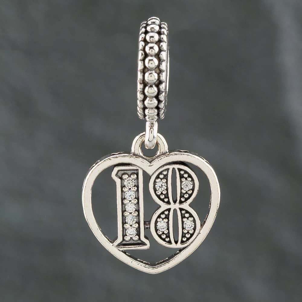 This ‘18’ charm from Pandora is perfect for immortalising momentous occasions. The ‘18’ is set with clear cubic zirconia stones and surrounded by a love heart frame which is suspended from a beaded loop. Make the number 18 unforgettable with this stylish Pandora pendant charm.