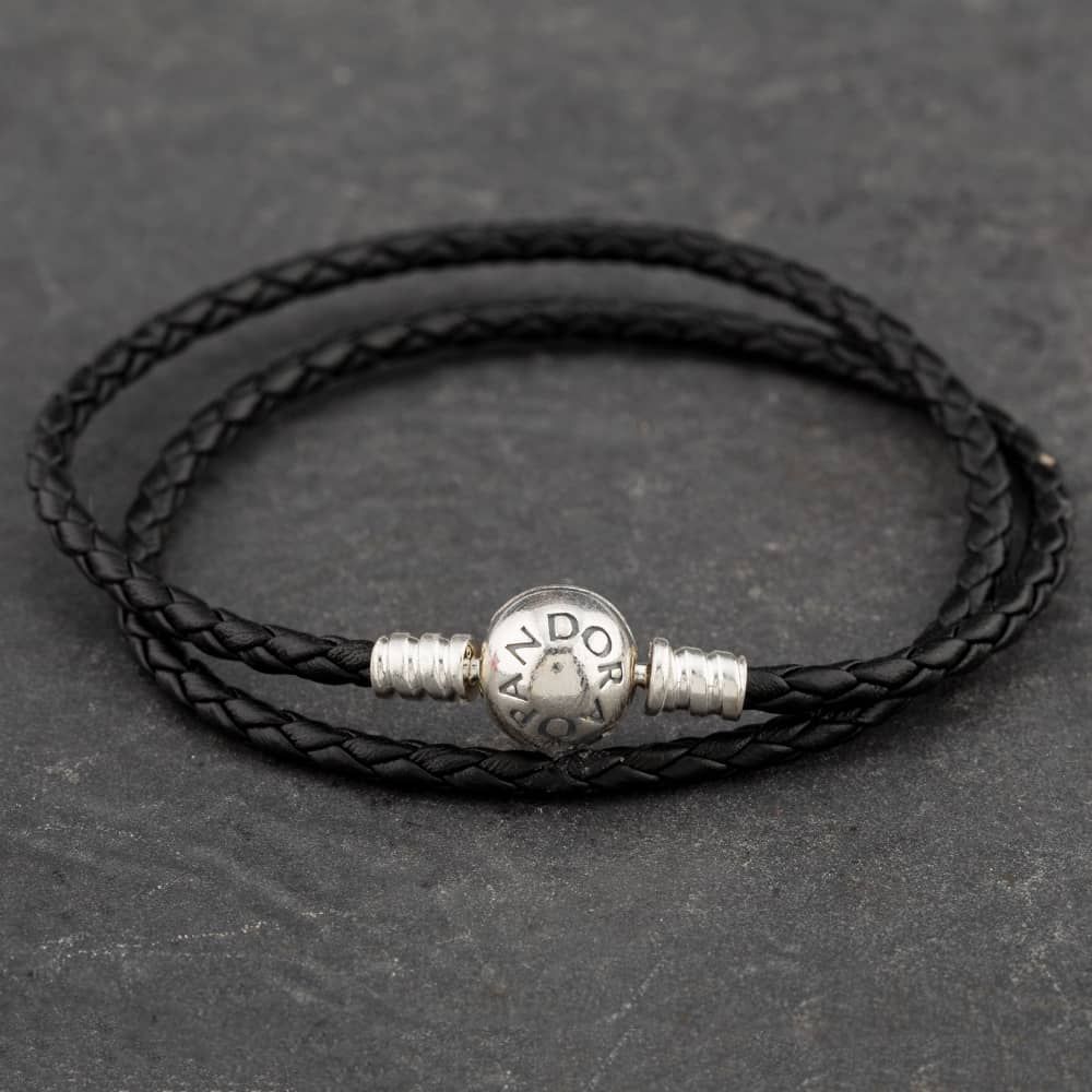 Pandora introduces this attractive double wrap black leather charm bracelet, featuring a branded sphere shaped clasp crafted from sterling silver. The intricately woven leather demonstrates the quality signature to Pandora, as well as offering an edgy alternative to the brands standard silver charm bracelets and bangles.