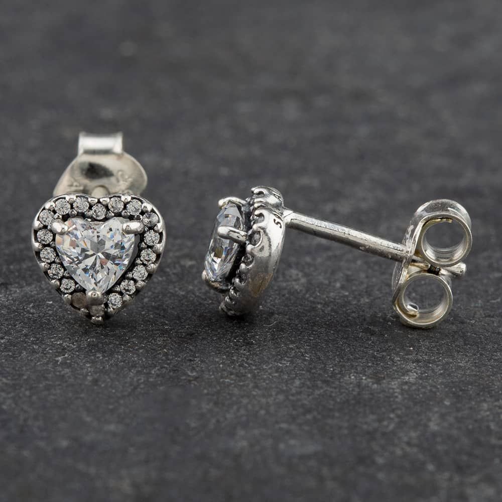A pair of sparkly stud earrings made from sterling silver with clear coloured heart shaped cubic zirconia stones set within three claws in the centre and framed by smaller stones.