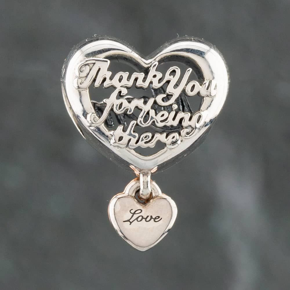 The Pandora Thank You Mum Heart Charm features as part of the Pandora People collection and is made from sterling silver and Pandora's signature 14 carat rose gold plated unique metal blend. The design consists of a love heart with openwork detailing and has M♥m on the front and Thank you for being there on the back. There are also two heart shaped pendants suspended below, the Rose coloured one says Thanks and the silver one says Love.