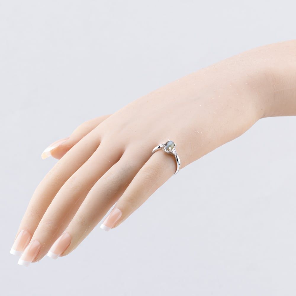 Platinum 1.49ct Cats Eye & 0.09ct Trillion Cut Diamond Oval Shoulder Set Solitaire Ring