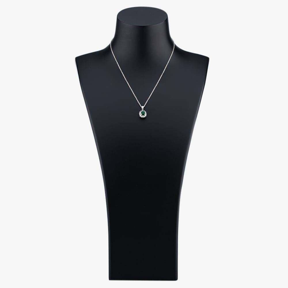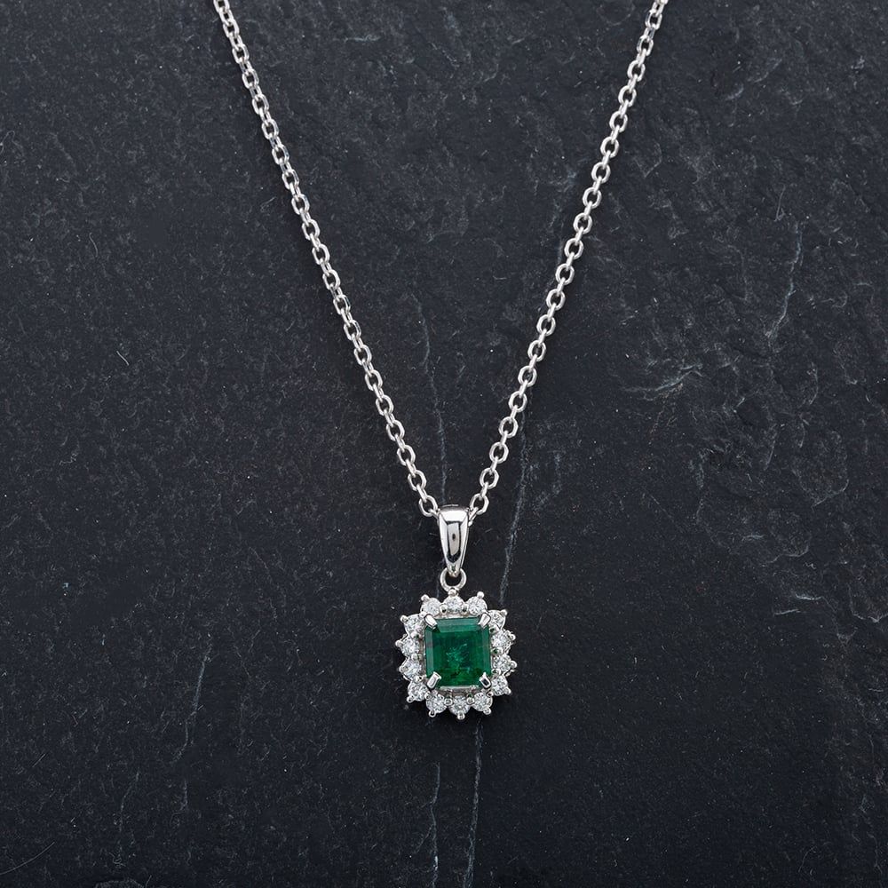 Platinum Square Cut Emerald 14 Brilliant Cut Diamonds Cluster Pendant On 14ct White Gold 15" Trace Link Necklace